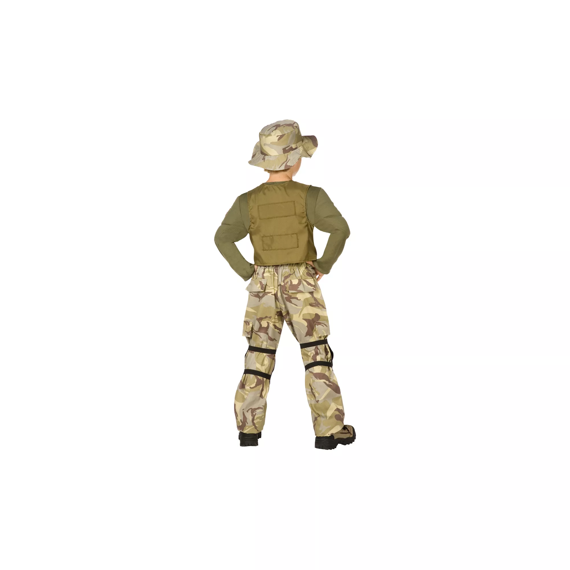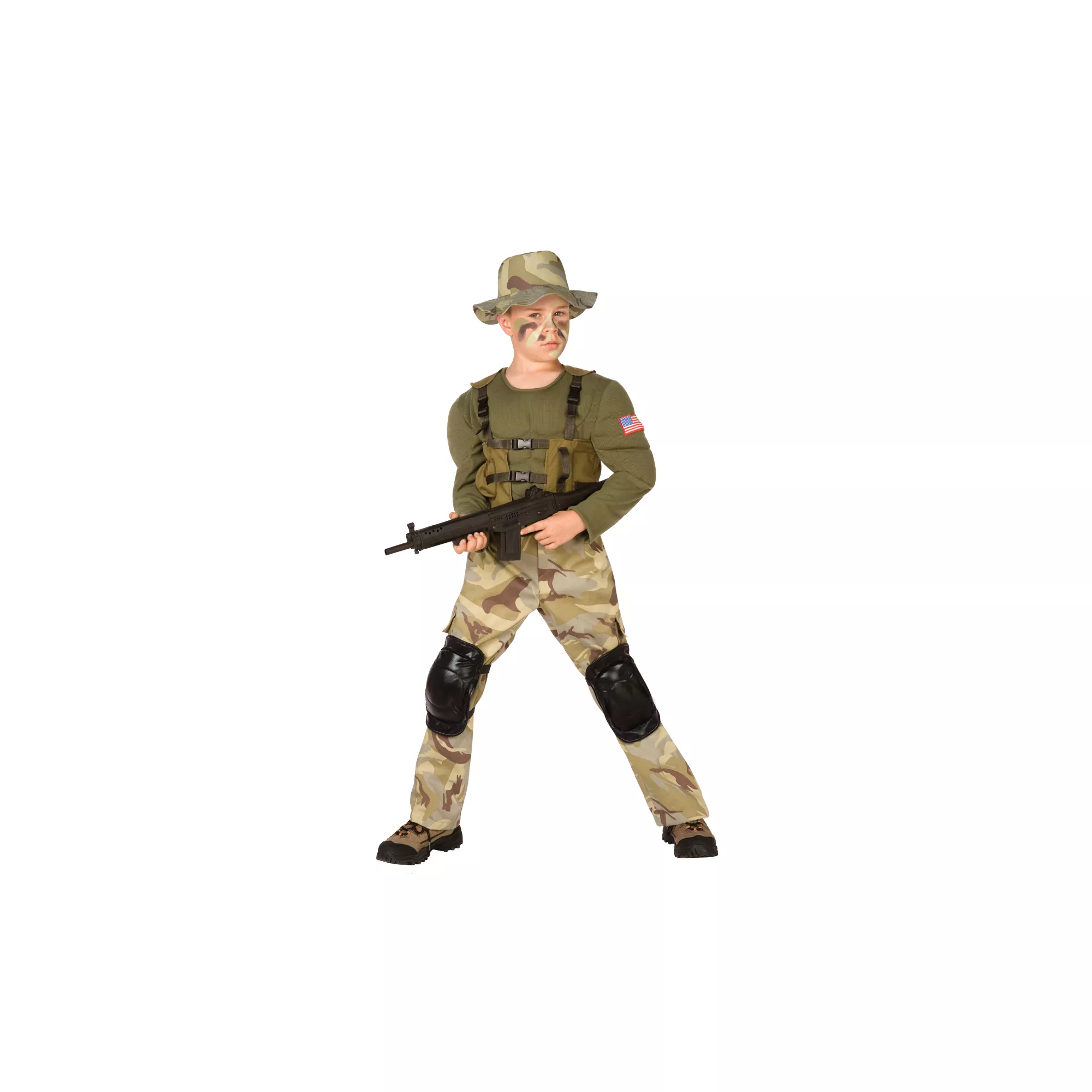 Plan your mission and execute it flawlessly in this official and authentic looking Special Ops Commando Boy's Costume. This costume includes a muscle top brown and green camo print jumpsuit, vest, knee pads and a boonie hat. You've got what it takes to pull off all sorts of evasive maneuvers on Halloween - wear it well.