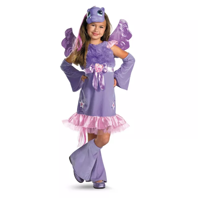 Have a fantastical Halloween in this officially licensed My Little Pony Star Song Deluxe child costume. Trot through the neighborhood in style with this purple dress, complete with detachable wings, tail, matching arm warmers, leg warmers and character headpiece.