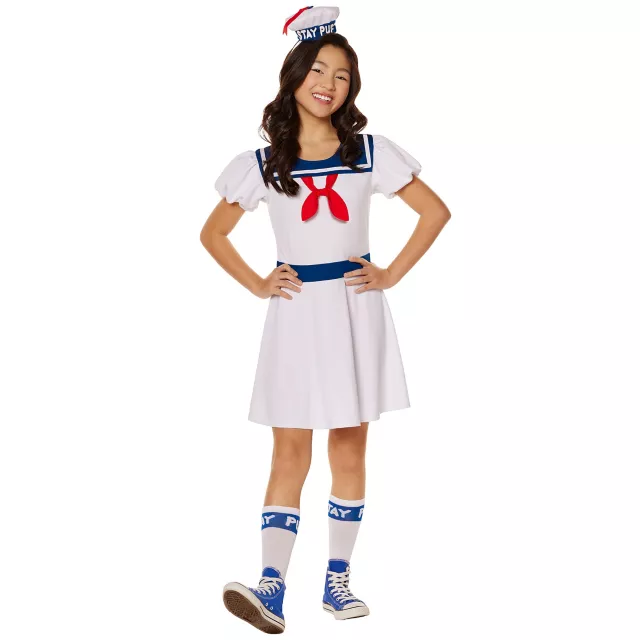 Constantly rewatching Ghostbusters? Show love for your favorite movie and wreak havoc at your next Halloween celebration when you wear this officially licensed Stay Puft Dress Costume. Featuring a blue and white dress, a matching pair of socks, and the signature Stay Puft headband, this theatrical set is perfect for any fan.