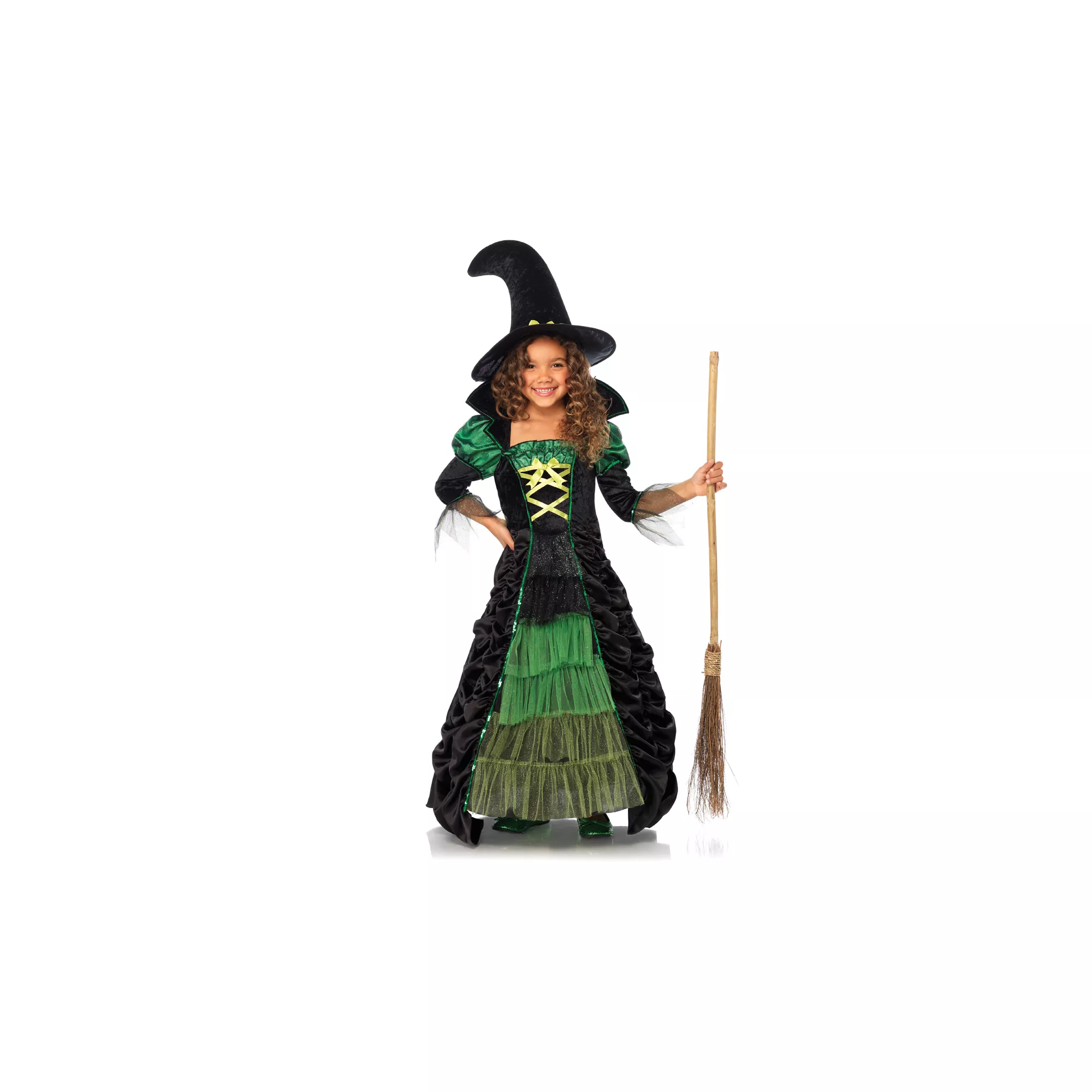No toil and trouble here in the Storybook Witch Girls Costume. This long, ruched dress features a green skirt inset and emerald puffy sleeves, a high-collar and traditional black witch hat. No cauldron needed for your little witch to brew up a sweet spell.