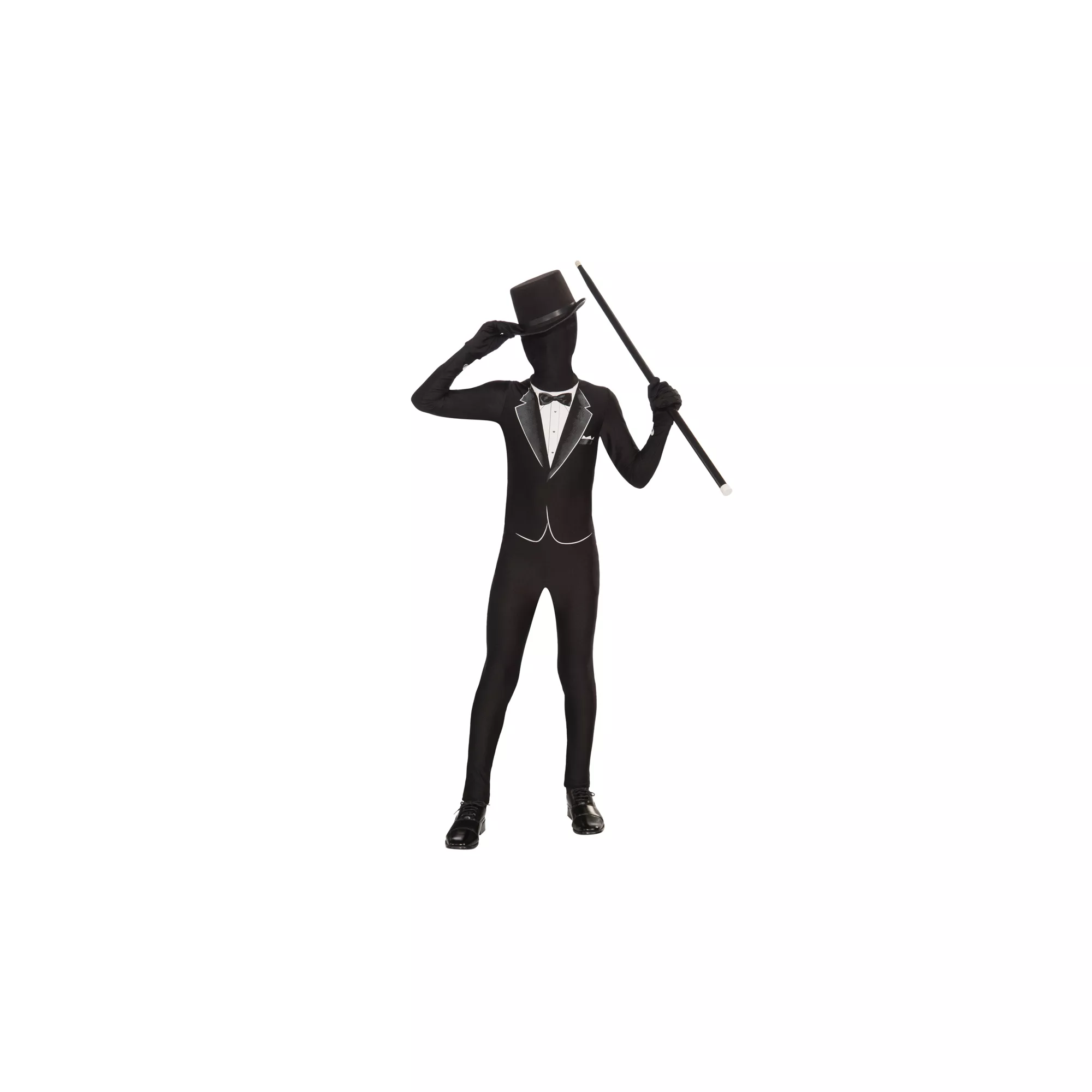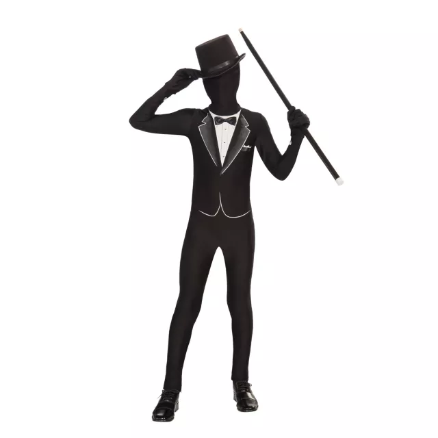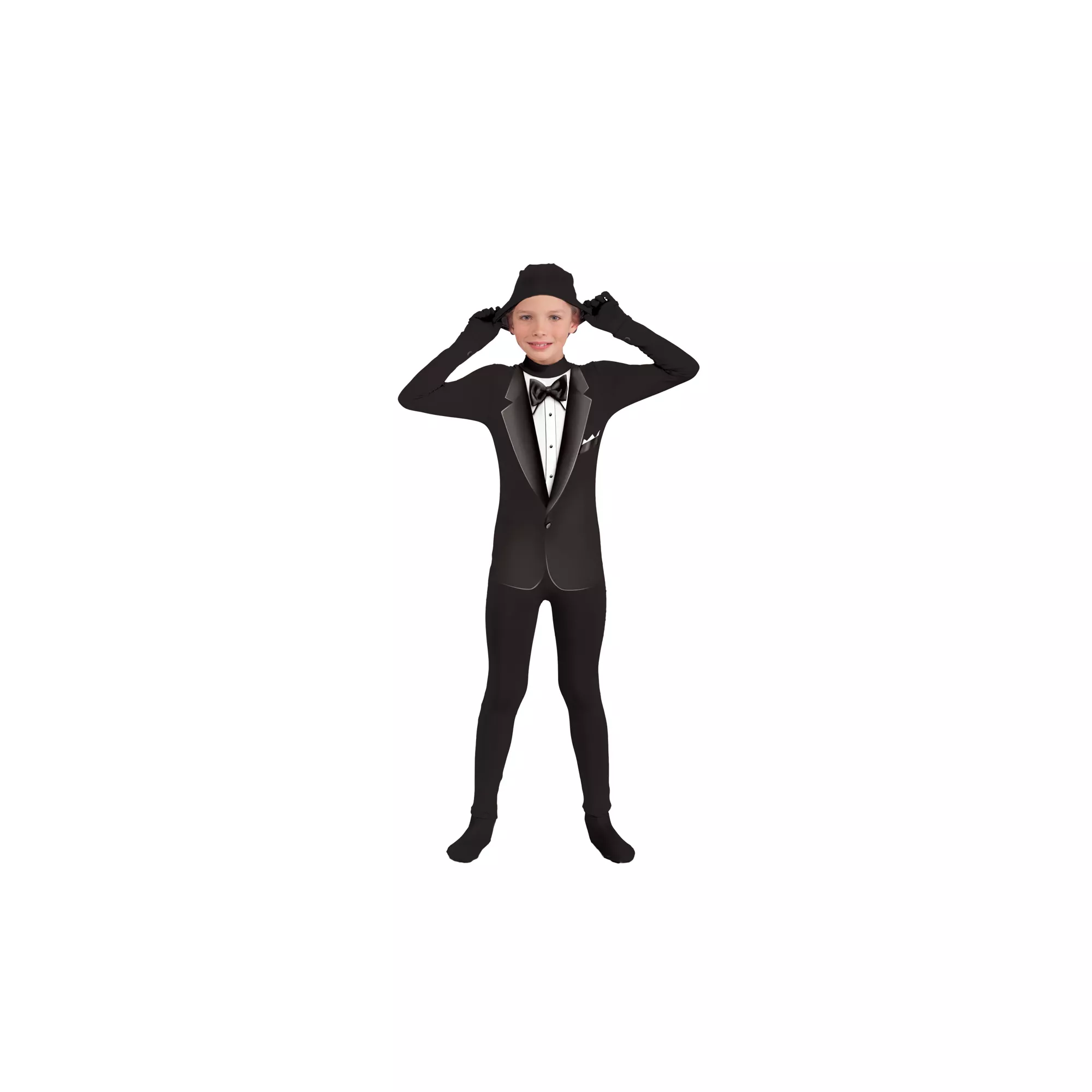 Get the party started when you strut in looking classy in this Tuxedo Super Skin Child Costume. Black screen printed tux skin suit comes complete with hooded mask, attached gloves and socks.