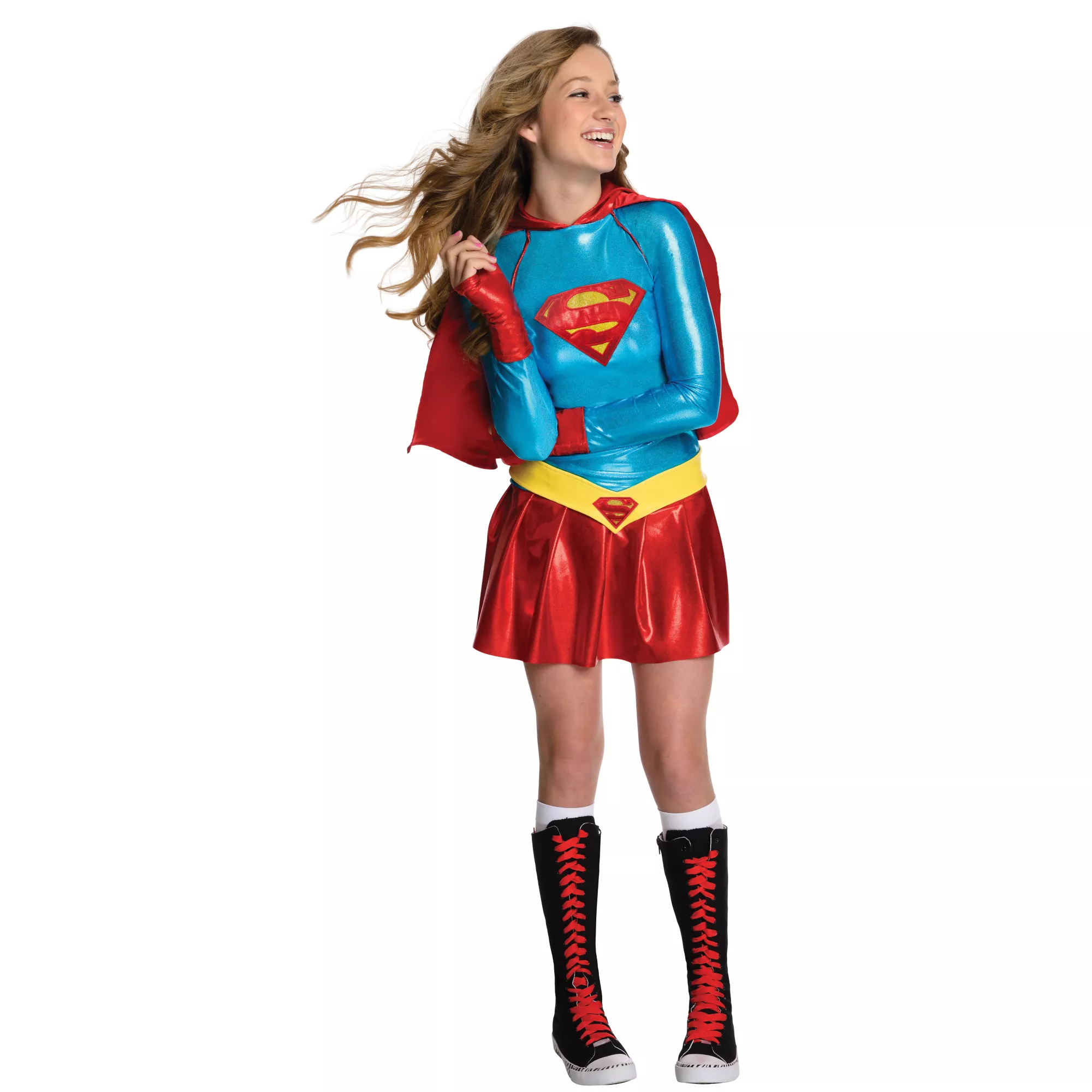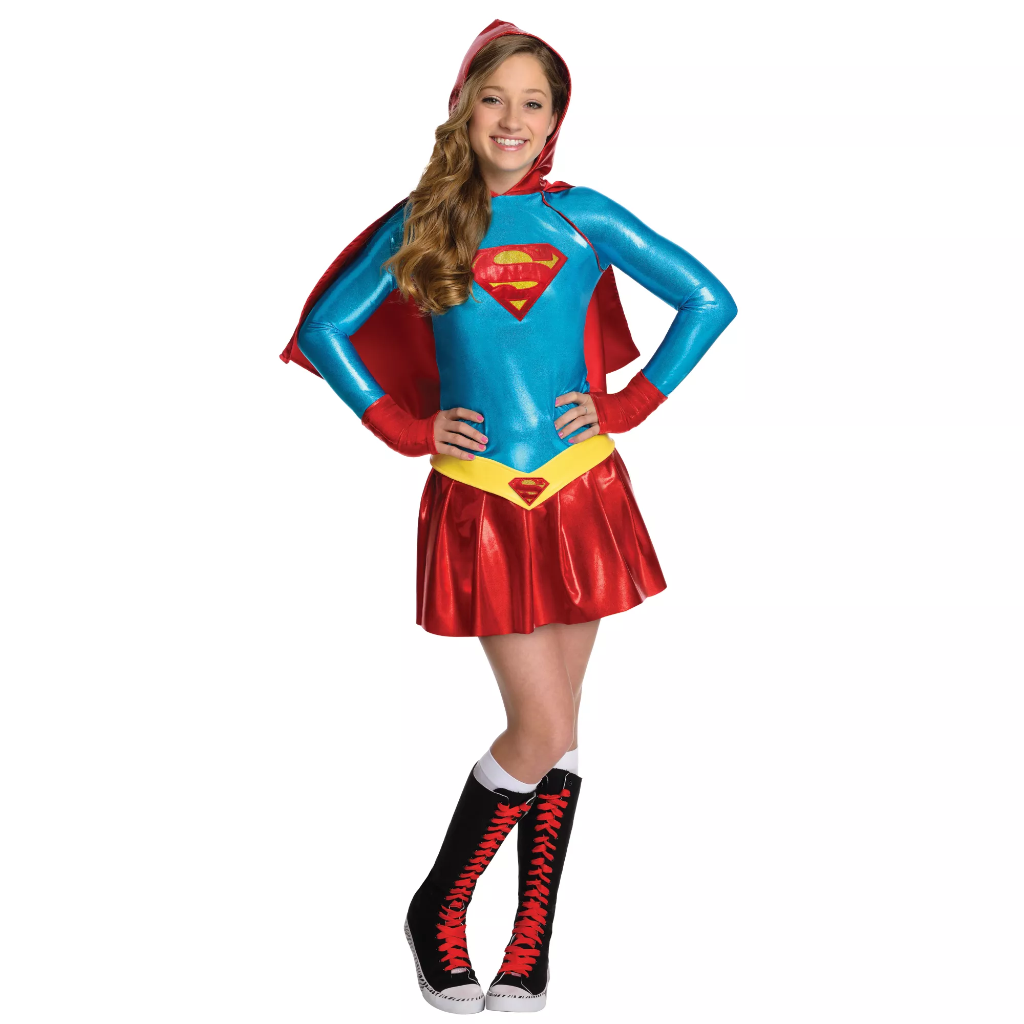 Save the holiday - from terror and spookiness - when you wear this officially licensed Supergirl Hoodie Girls Costume. Blue and red shimmery character dress with attached cape give you a glamorous superheroine look. Don't forget the gloves and gold belt with signature logo to create the full effect.