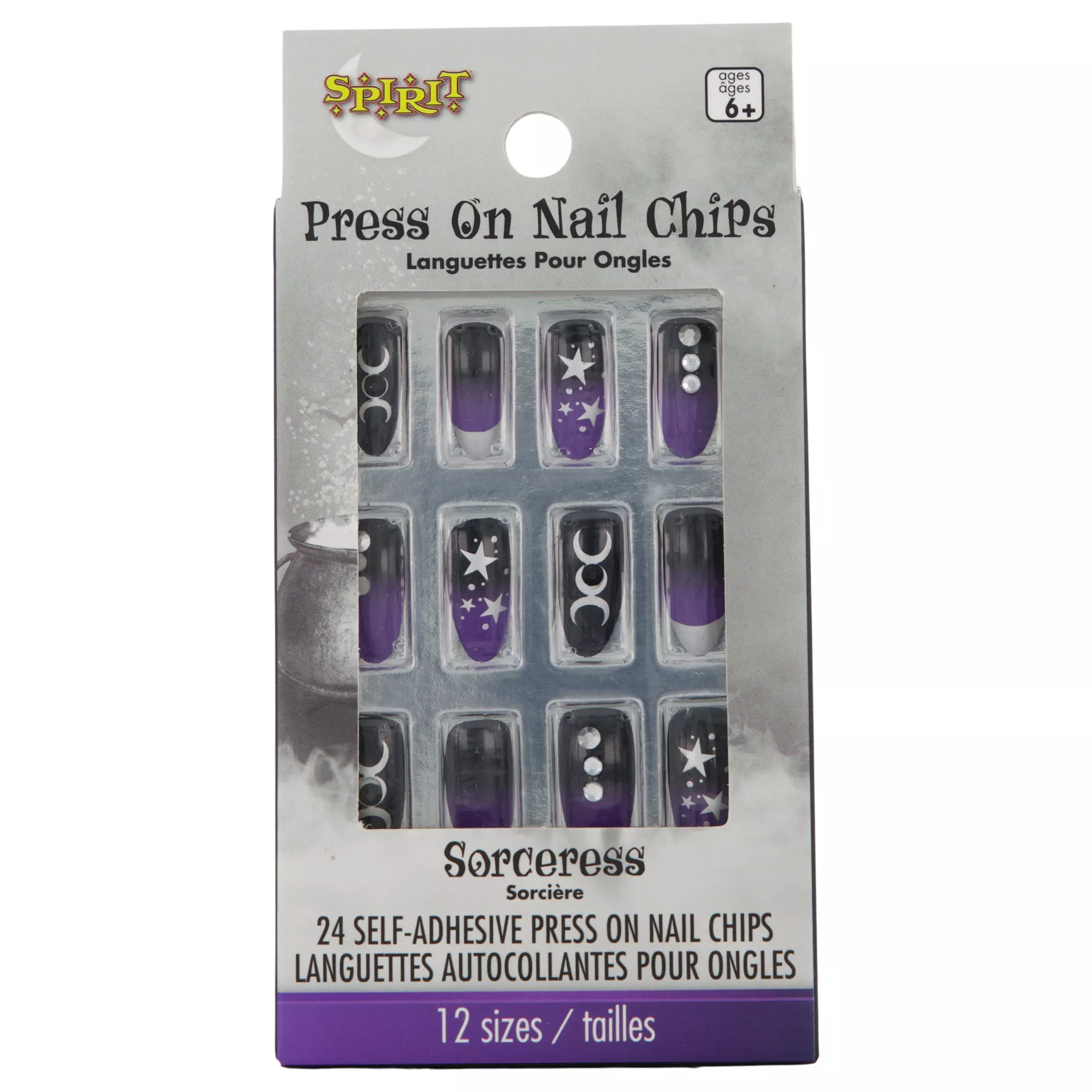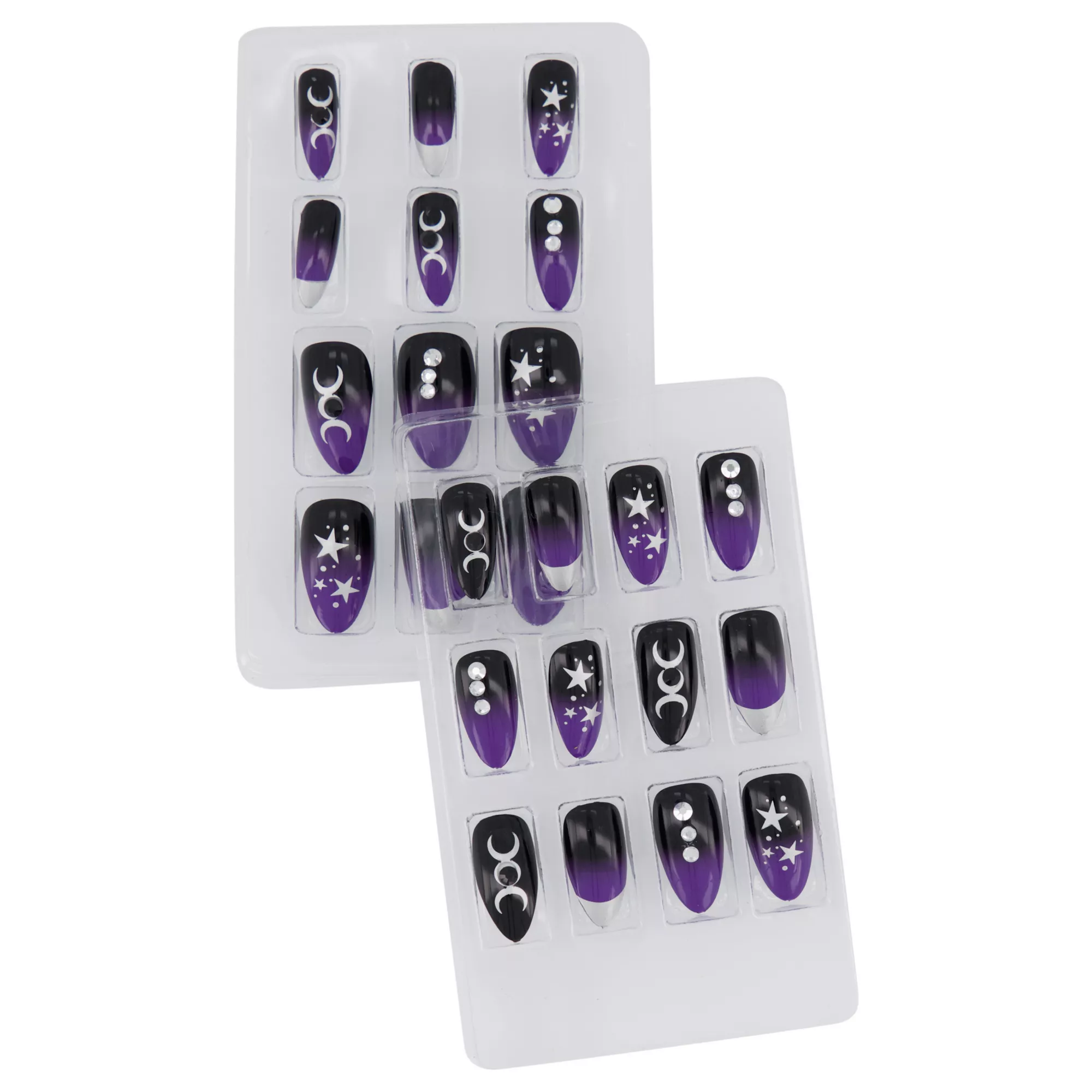 Complete your sorceress look with these black, purple, and silver press-on nails!