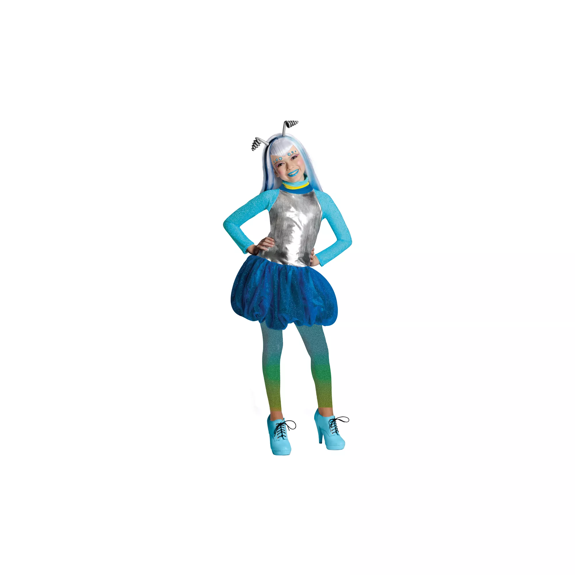 Be the diva of the group in this Novi Stars Una Verse Deluxe Child Costume! You'll stand out among everyone around you wearing Airissa's signature metallic blue dress and colored tights fading from blue to green representing the colors of the ocean.