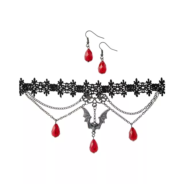 Complete your vampire style with this jewelry set! In bold black and blood red hues, this bat charm choker necklace and faux ruby earrings set is a must-have for little vampires.