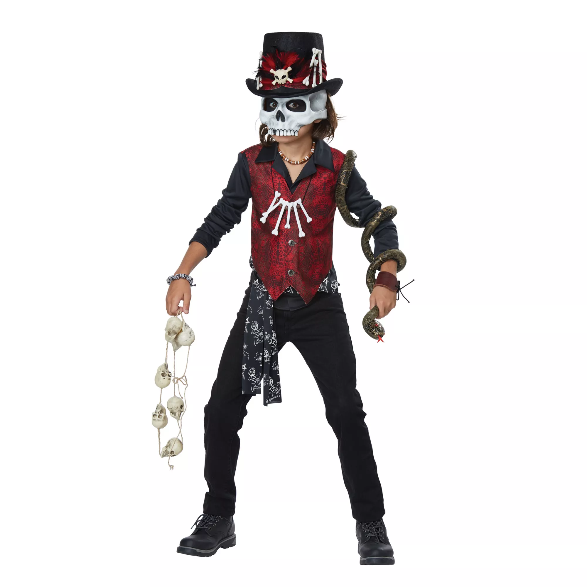 Cast some spells, collect some bones and get to trick-or-treating! This amazing voodoo hex costume comes with a vest and attached shirt, a decorated top hat, half mask, bone necklace and a fashionable waist tie! Add some extra accessories and you'll be ready for a night of fun!