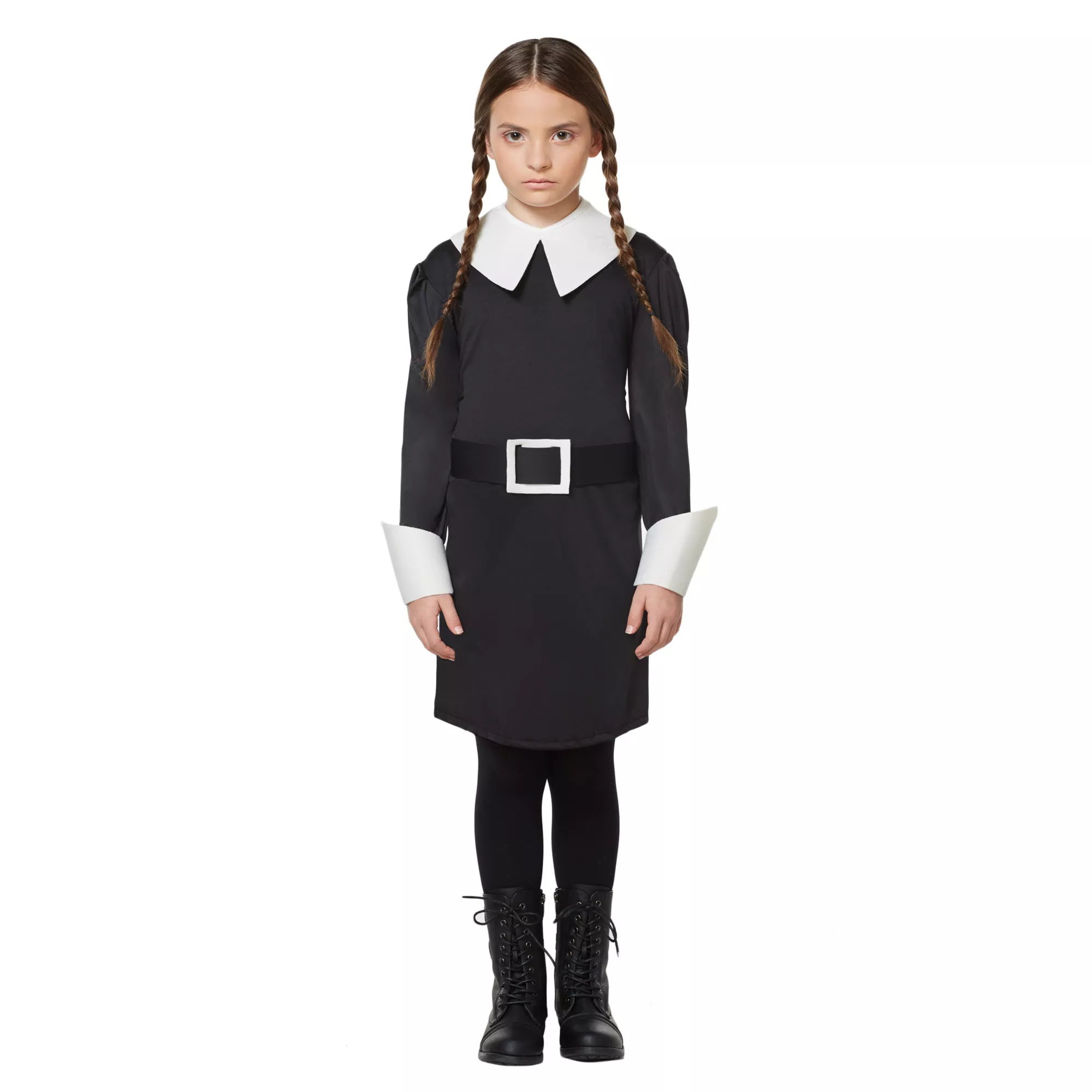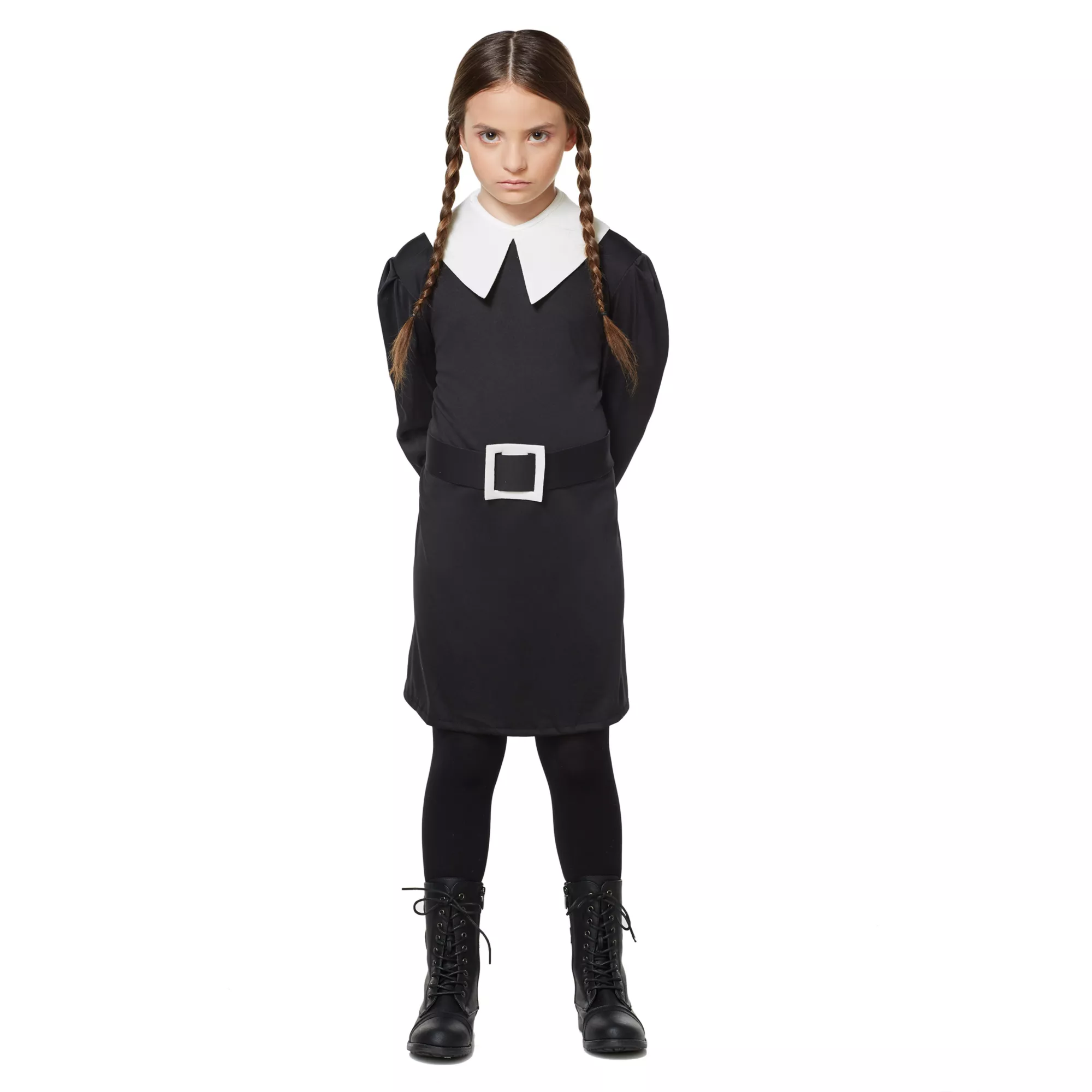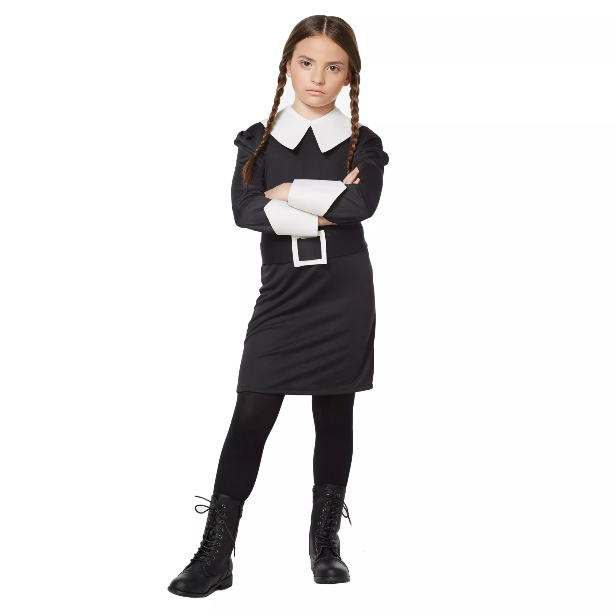 Your solemnness is spoken for in the officially licensed Addams Family Wednesday Addams Girl's Costume. Create a little havoc in the black dress with white collar and cuffs, complete with matching belt.