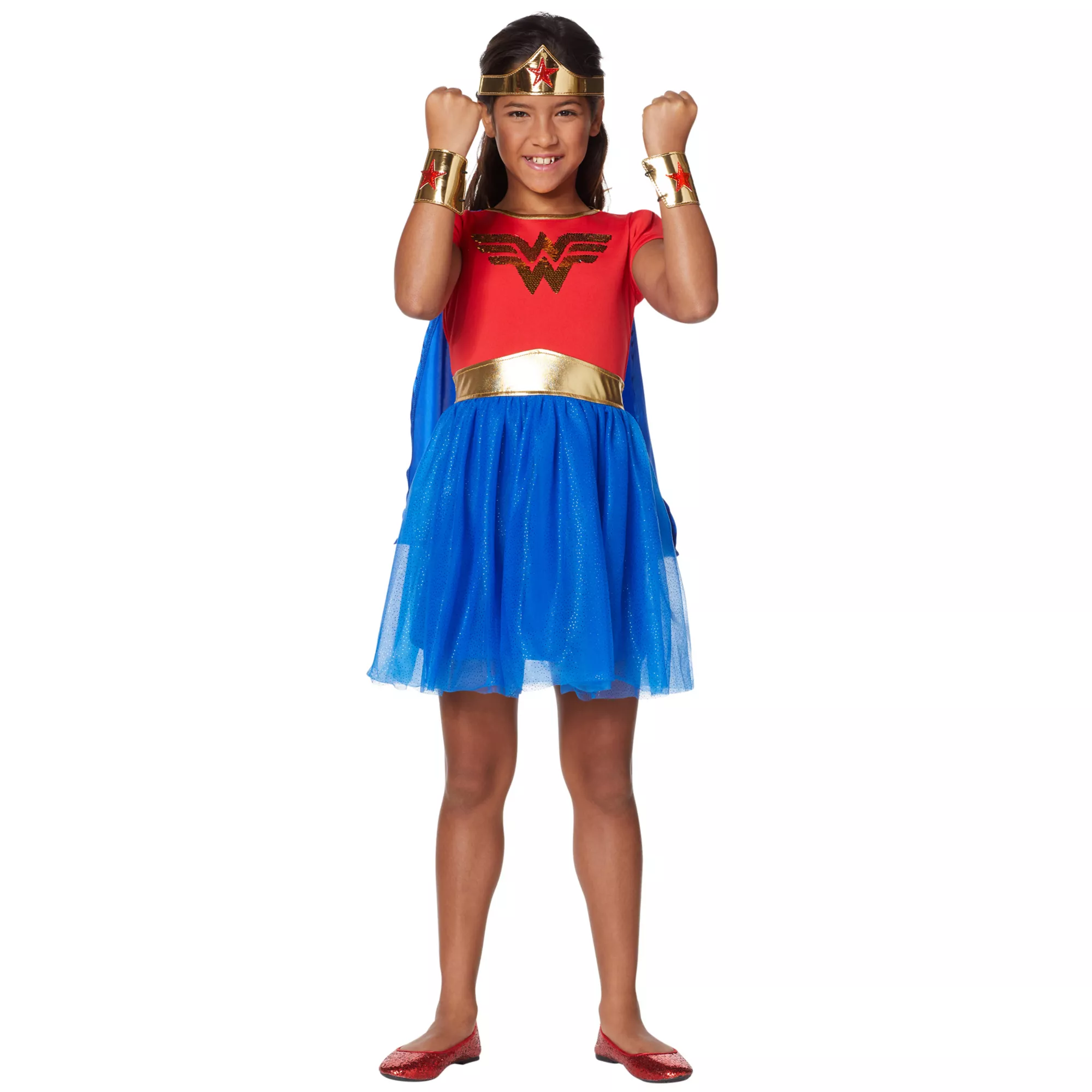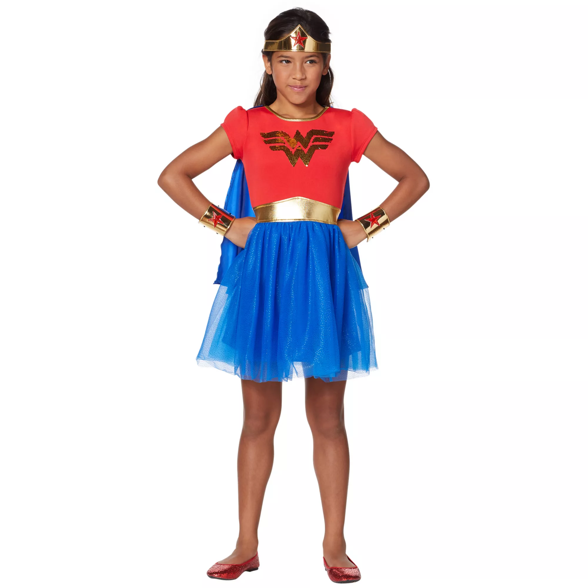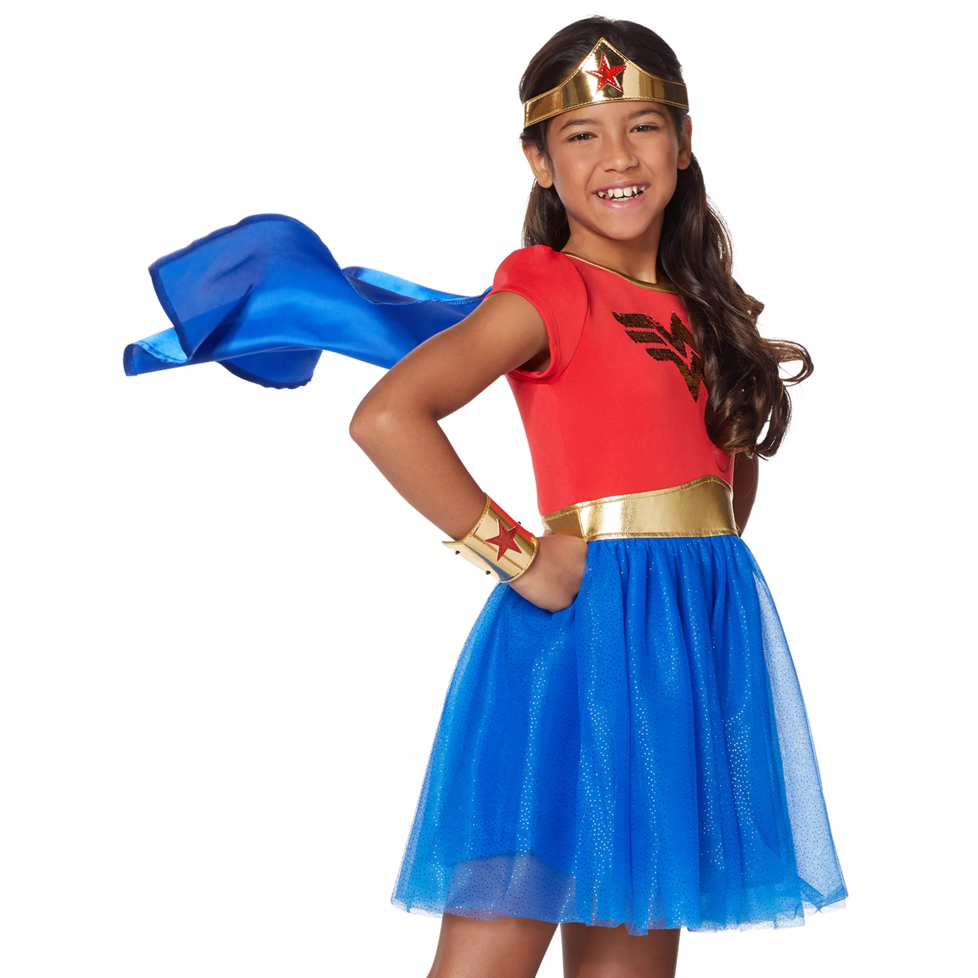 Your little girl will look SUPER in this kids Wonder Woman dress costume. With a velcro, detachable cape featuring Wonder Woman's signature logo, she'll be ready to soar door-to-door for candy this Halloween! She'll even love playing around with the reversible sequined Wonder Woman logo on the front of the dress!