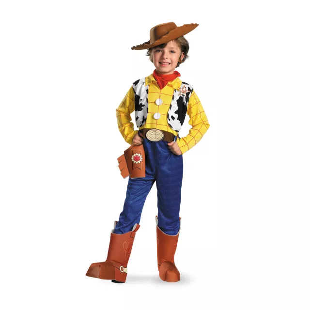 Saddle up for a fun Halloween when you wear this officially licensed Disney Toy Story Woody deluxe child costume. The 100% polyester character jumpsuit of this boys costume is styled to look like a shirt and pants with a vest and holster. Boot covers with spurs, a cowboy hat and bandanna complete this character costume.