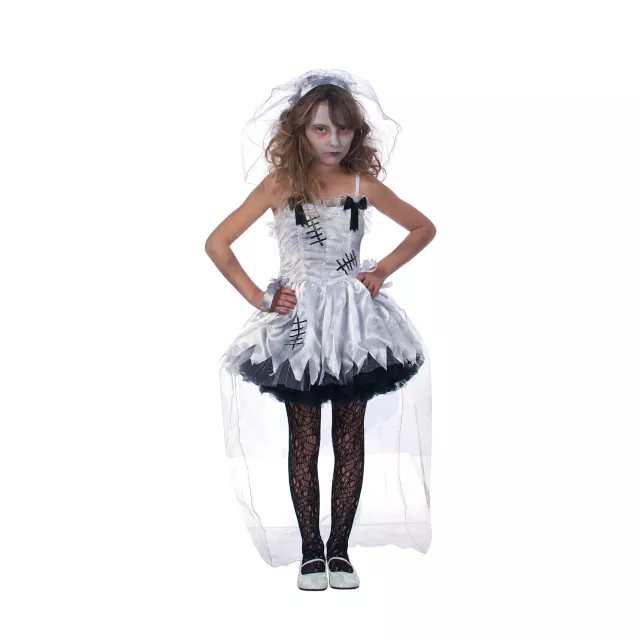 Join the bride and groom in their everlasting union as the sweetly scary Zombie Flower Girl Child Costume! Terrify all the wedding guests in this darling and dark white dress with stitching details and torn hem. Float through the night with your eerie veil that leaves people with a chill that has nothing to do with the night air. The wispy white veil almost makes you look innocent, but your demeanor is enough for everyone to run before the reception.