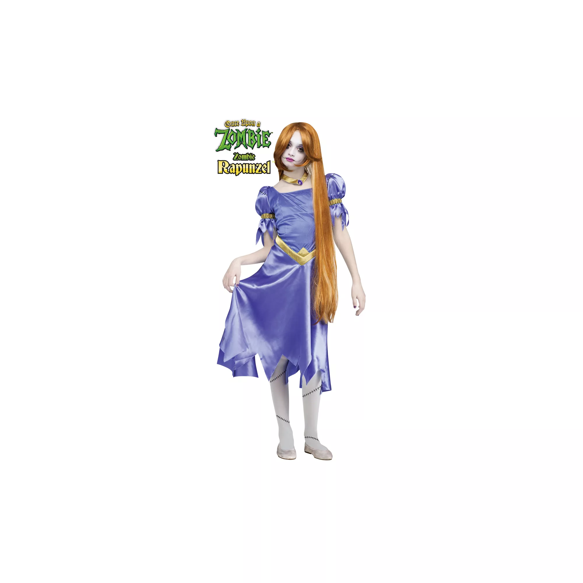 Your beauty almost distracts from your flesh eating ways in the Officially Licensed Once Upon A Zombie Rapunzel Child Costume. Let down your hair (sold separately) in this shiny purple-blue dress with gold accents and matching choker.
