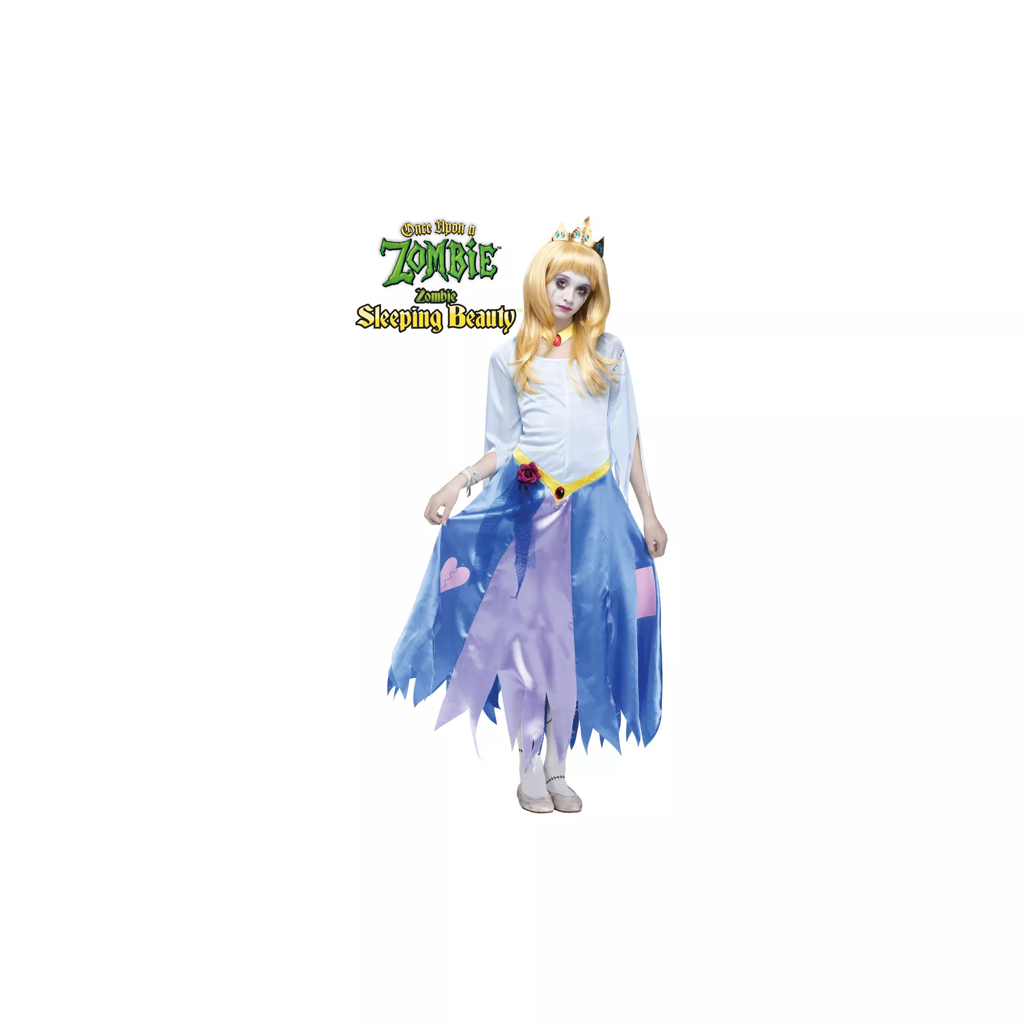 This Sleeping Beauty awoke to life as a zombie! The Officially Licensed Once Upon A Zombie Sleeping Beauty Child Costume takes a spooky twist on this classic princess. Features shredded blue gown, gold crown, gemstone choker and detailed tights.