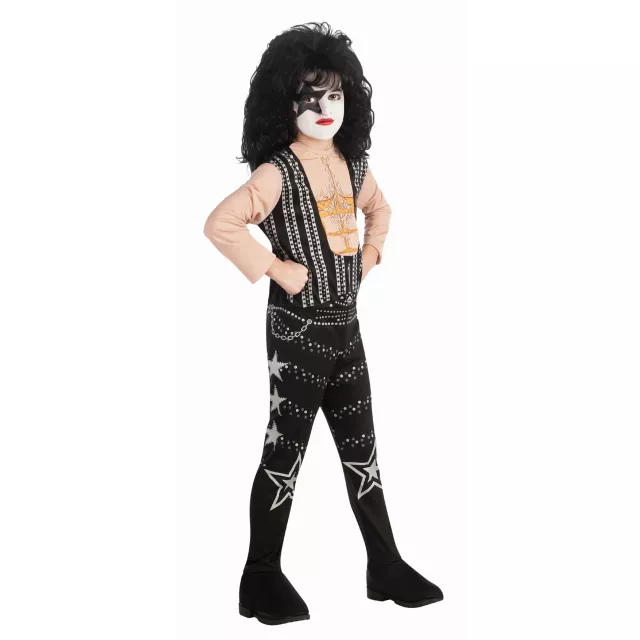 Feel the love when you rock the neighborhood on Halloween in this officially licensed KISS Starchild child costume. The black, 100% polyester printed jumpsuit features a faux exposed chest and arms along with silvery accents, complete with attached boot covers and a character wig.