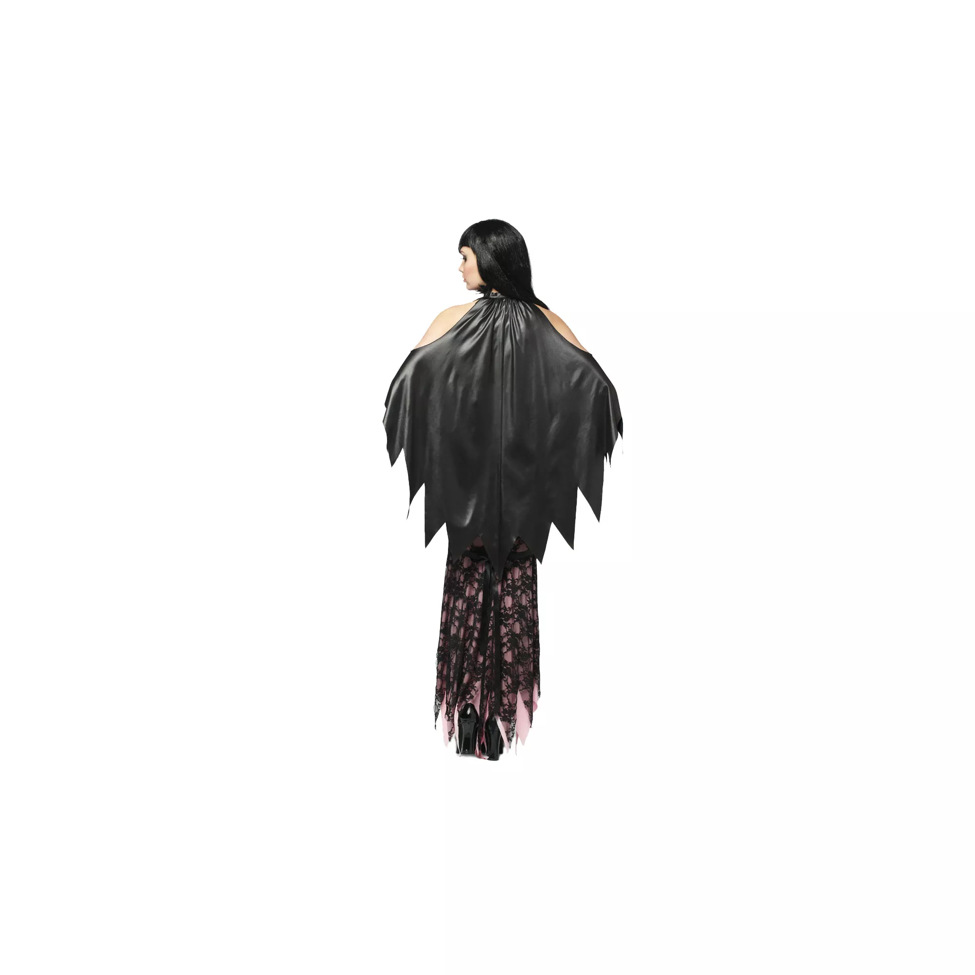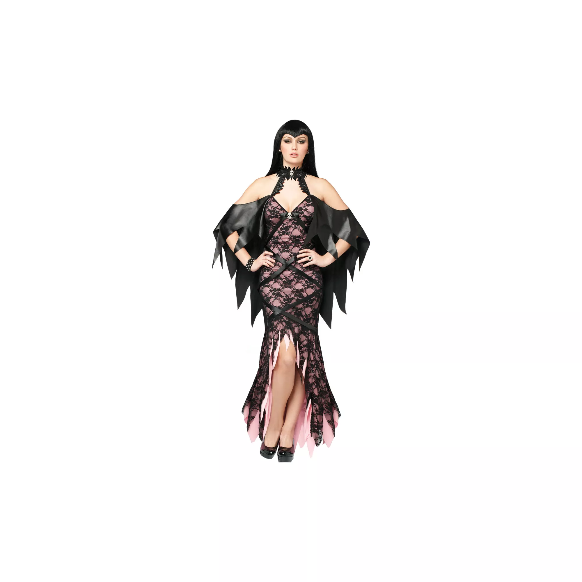 You'll have your choice of any neck in the room wearing this Lacy Vamp Adult Women's Costume. This light pink dress features a knee slit, tattered hemline, black lace overlay and an attached black collar with tattered jagged edged cape.