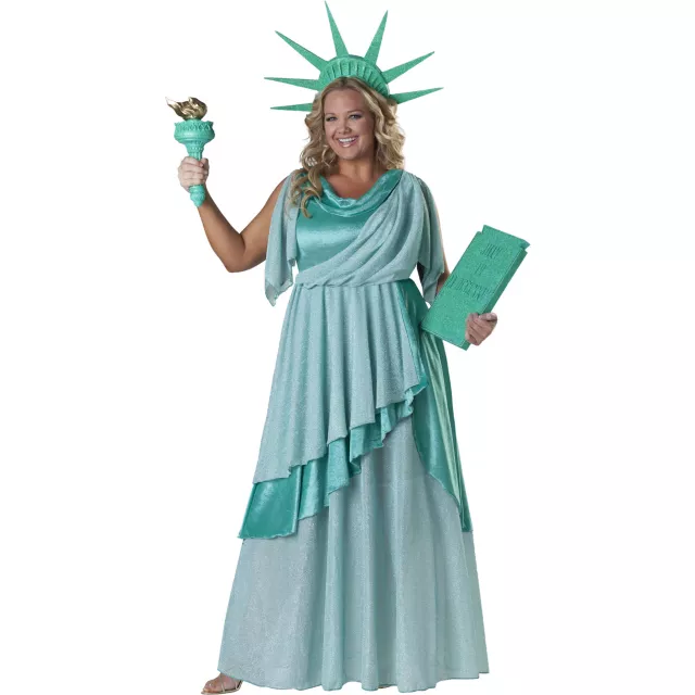 Give everyone hope in freedom and opportunity when you wear the Lady Liberty Deluxe Adult Women's Plus Size Costume. This gorgeous, turquoise, full-length dress features an attached drape overlay and comes complete with a tulle petticoat, crown, book, and torch.