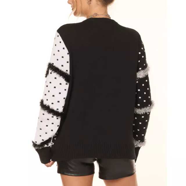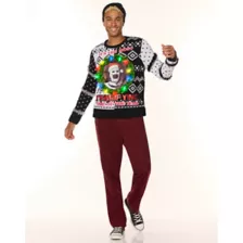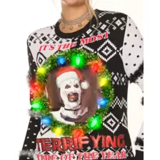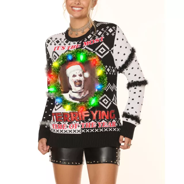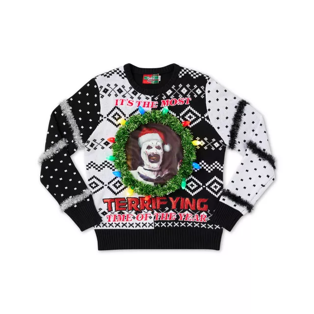 Turn the holidays into the most terrifying time of the year with this officially licensed Light-Up Art the Clown Christmas Sweater! Decked out in black, silver, and green tinsel, an eerie Art the Clown wreath with blinking Christmas lights, and Art's chilling honking horn, this sweater will bring your worst nightmares to life this holiday season!