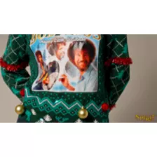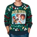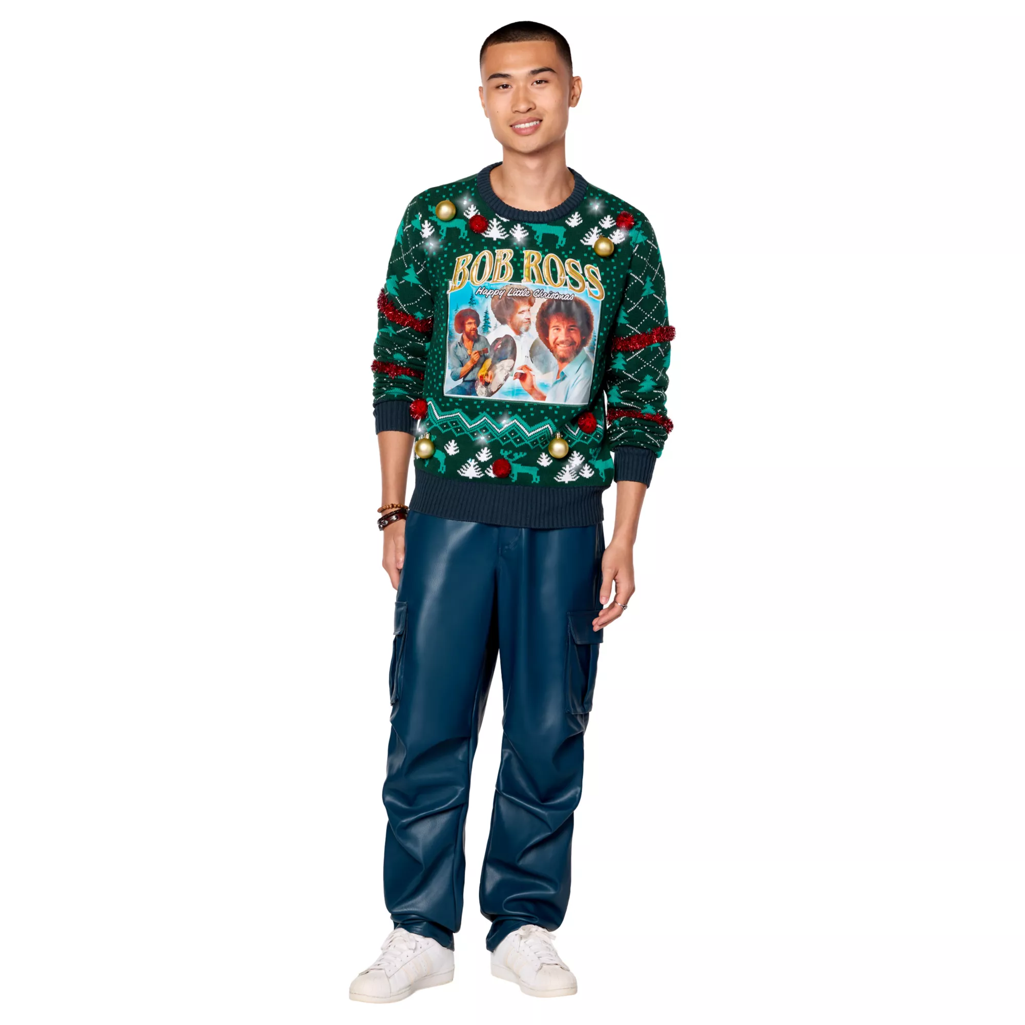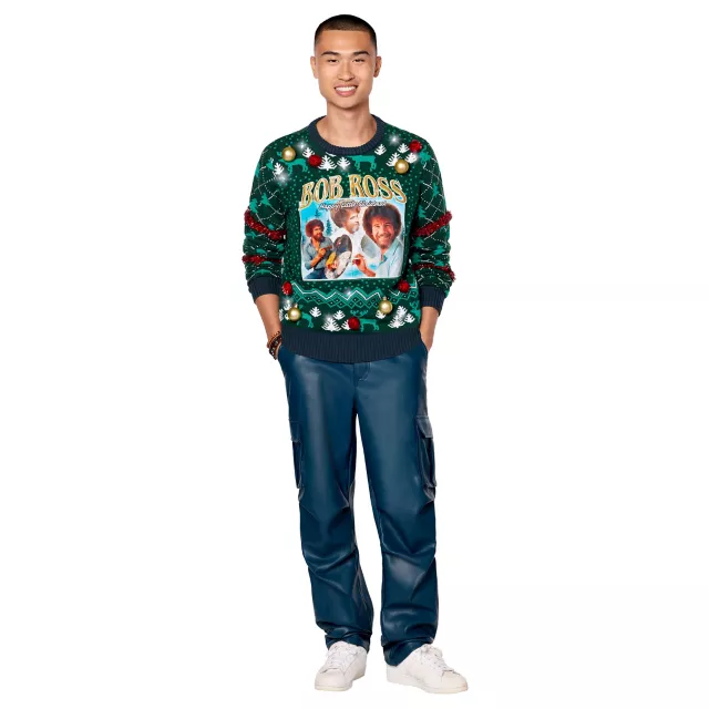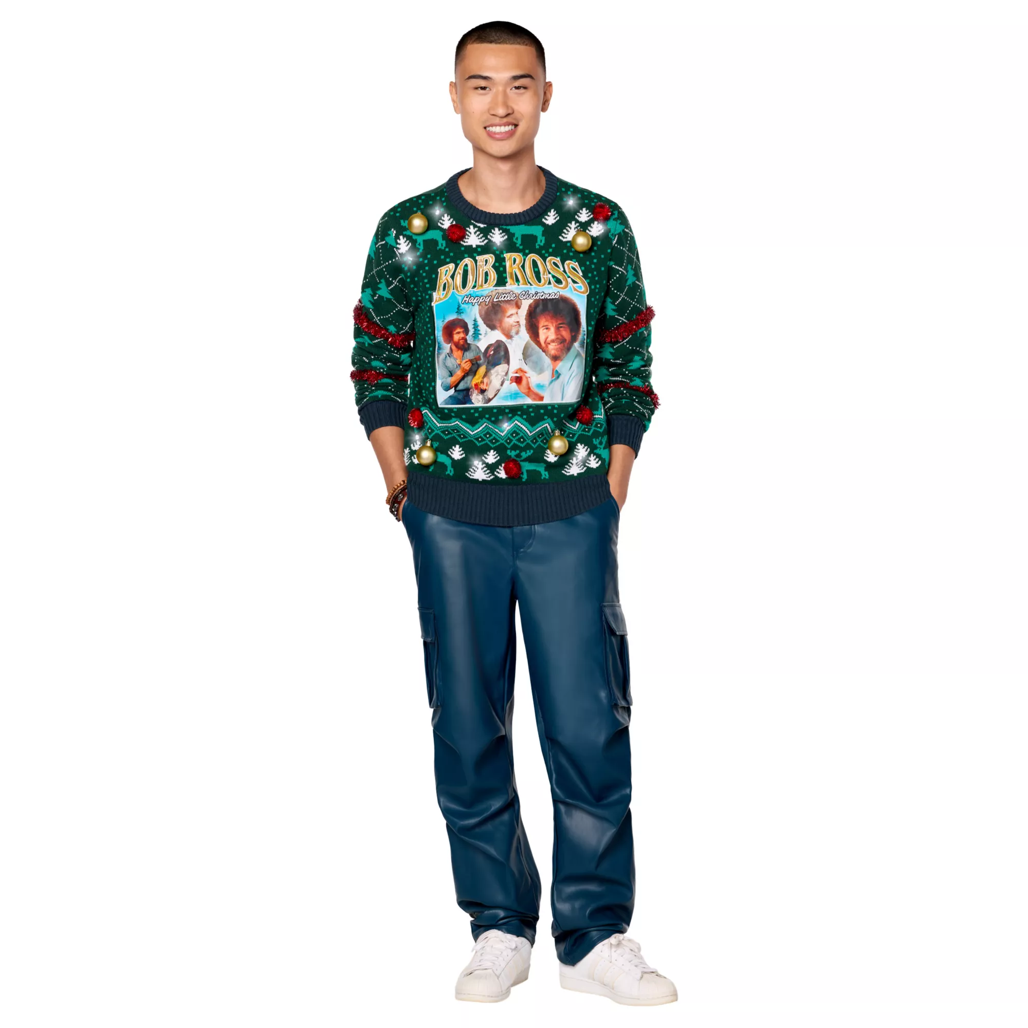 Have a "Happy Little Christmas" and paint the holidays bright with this officially licensed Light-Up Bob Ross Happy Little Christmas Sweater. Featuring the legendary Bob Ross surrounded by twinkling lights, snowy trees, and just a few "happy little accidents," this masterpiece will turn heads at any holiday gathering!