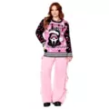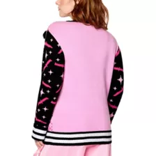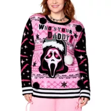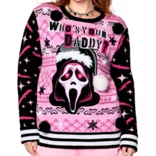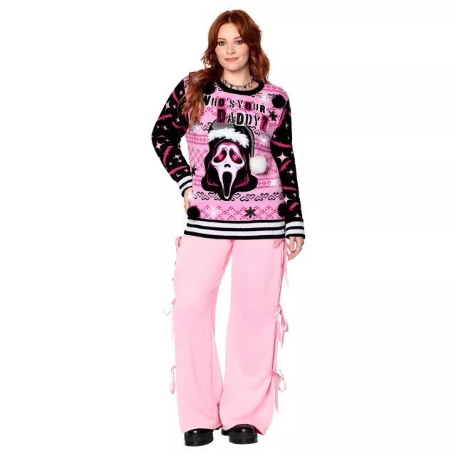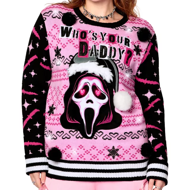 It's the most wonderful time of the year! Spread holiday FEAR with this officially licensed Light-Up Ghost Face Who's Your Daddy Christmas Sweater. This pink and black bubblegum horror sweater features black pom-poms, an embroidered Ghost Face Santa with light-up heart eyes, a 3D hat pom-pom with white fur, and holiday lights that cycle through three different flashing modes!