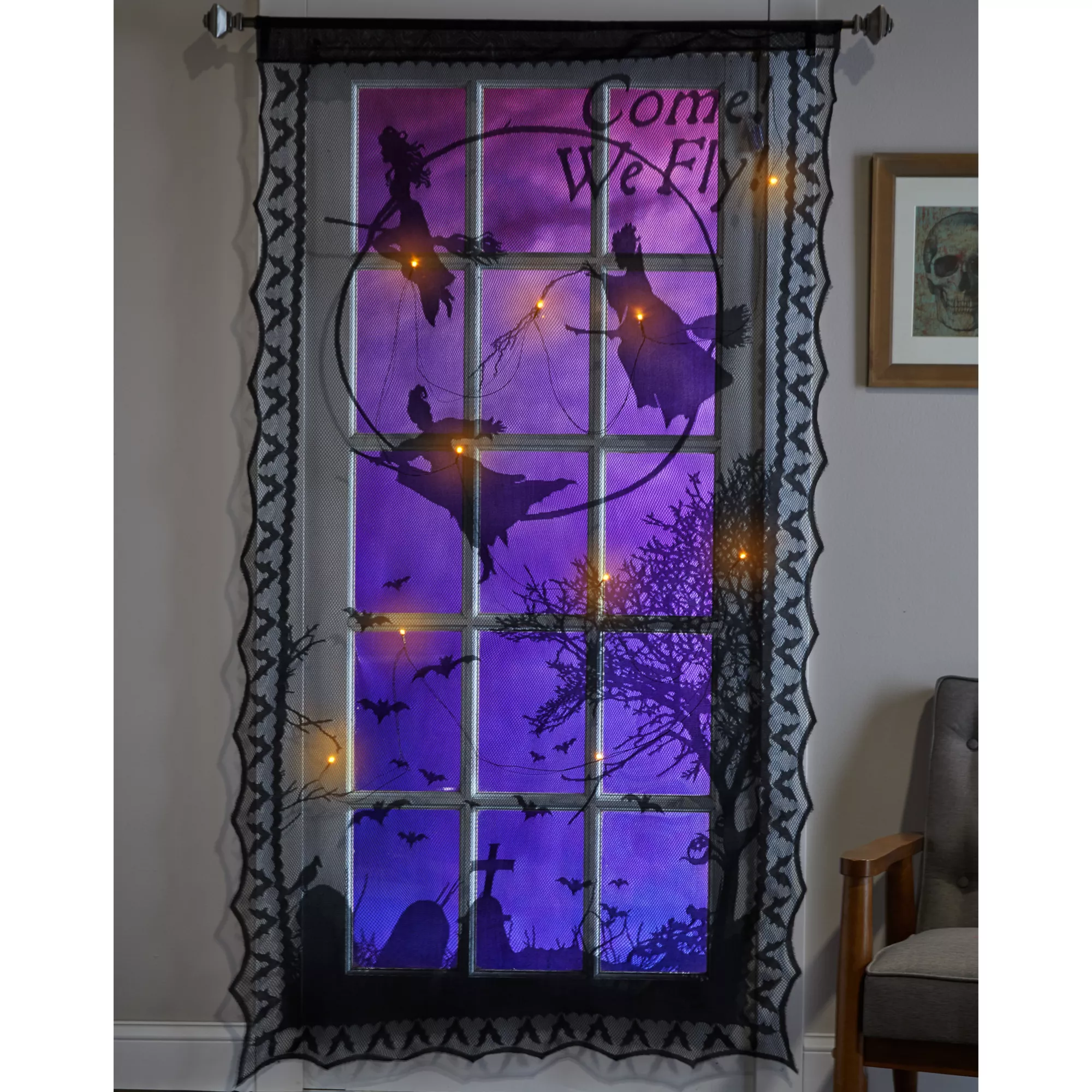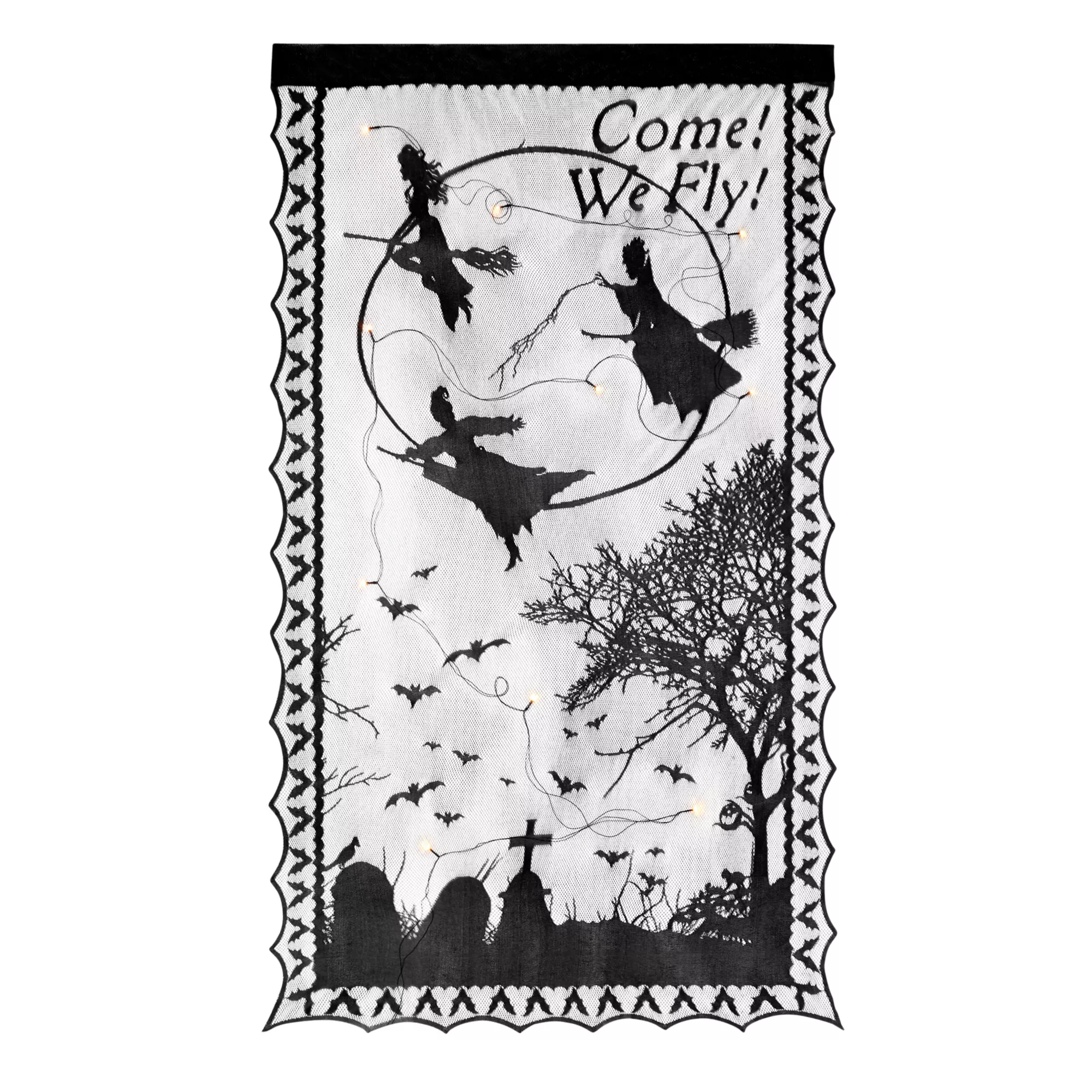 Come! We fly! Transform your space into a spook-tacular setting with this light-up Hocus Pocus panel. This decorative panel features an ornate lace border, flecks of glowing light, and the recognizable silhouettes of the Sanderson sisters!