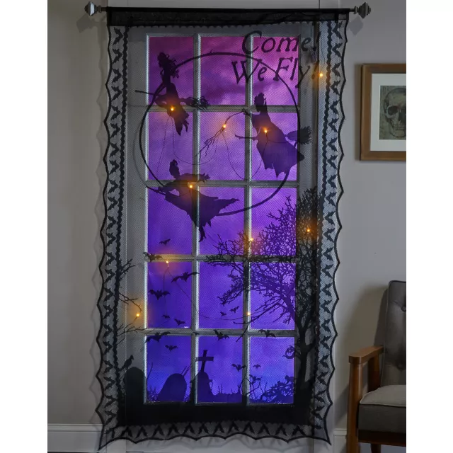 Come! We fly! Transform your space into a spook-tacular setting with this light-up Hocus Pocus panel. This decorative panel features an ornate lace border, flecks of glowing light, and the recognizable silhouettes of the Sanderson sisters!