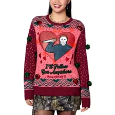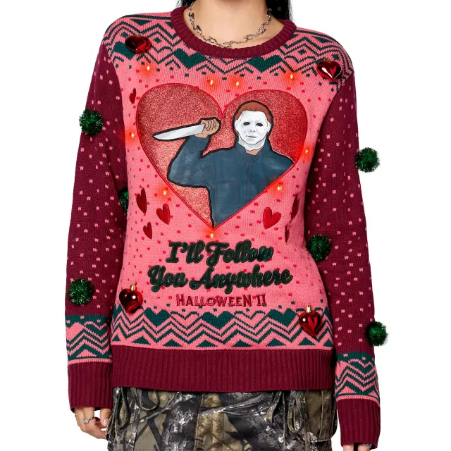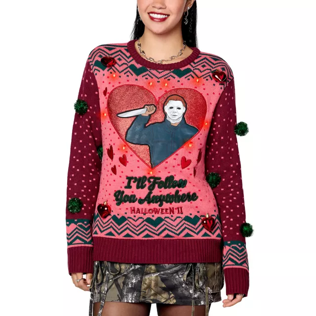 Santa is watching, and so is Michael Myers. Show love for your favorite horror villain in this officially licensed Light-Up Michael Myers I'll Follow You Christmas Sweater. Inspired by Halloween II, this chillingly adorable sweater features red hearts and green ball ornaments, three light-up settings, and an image of Michael that'll make any horror fan blush!