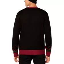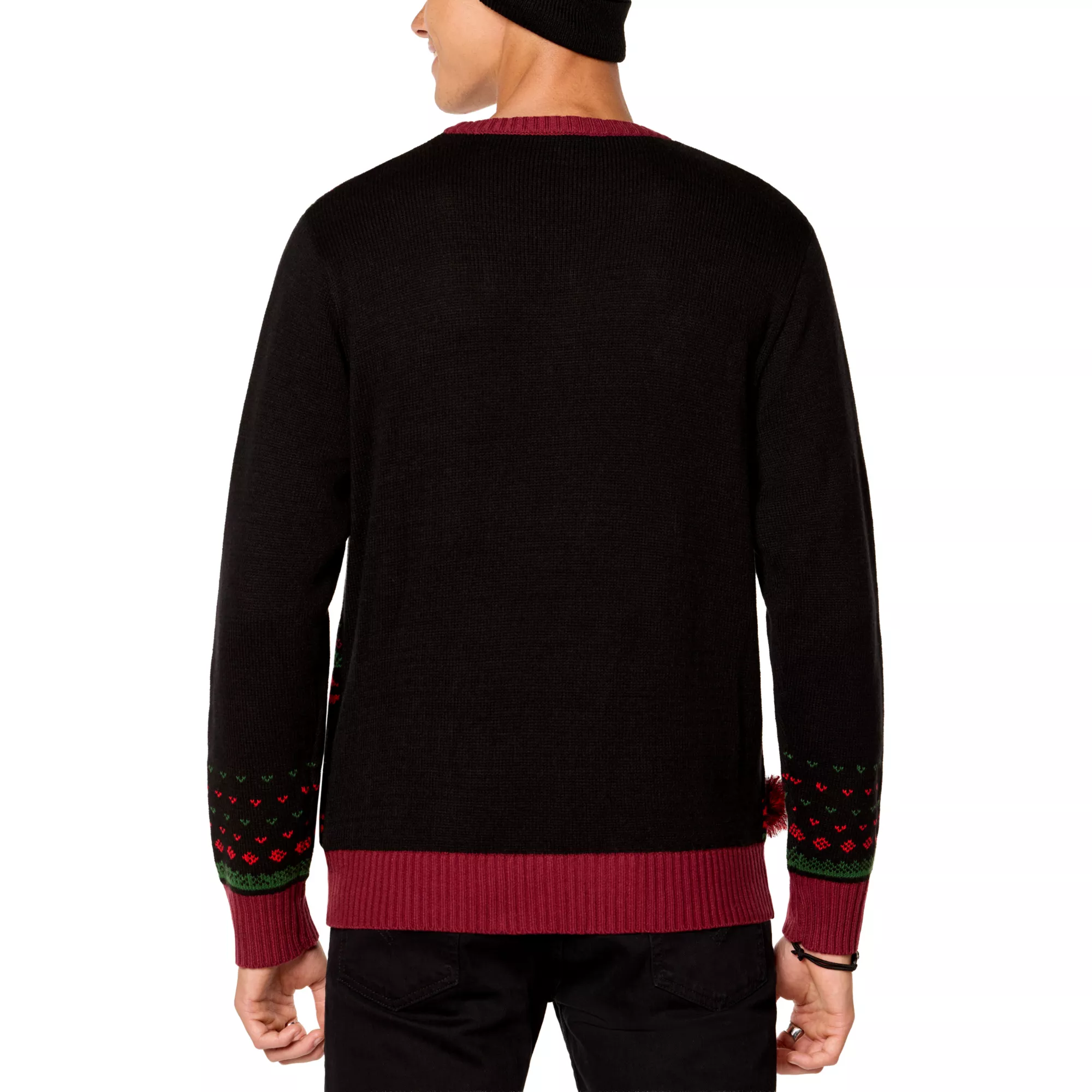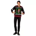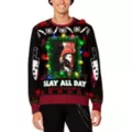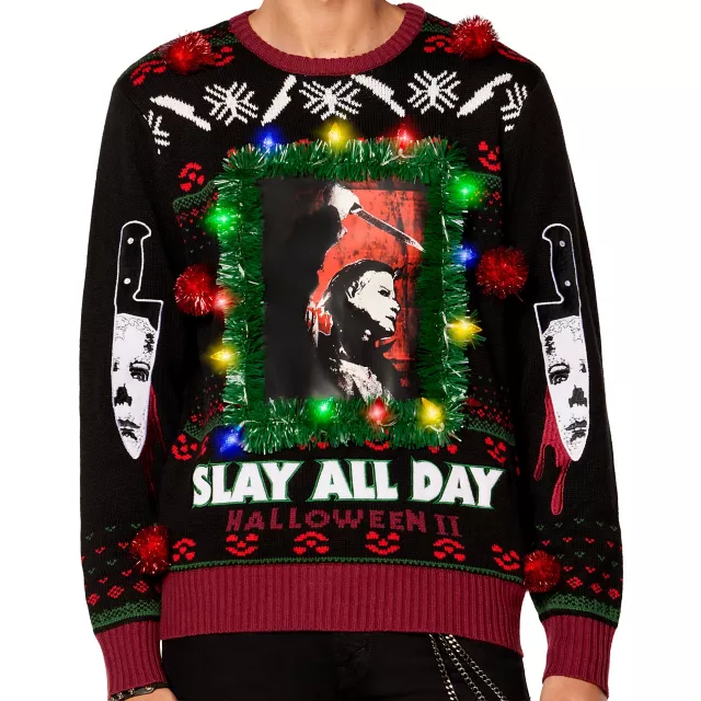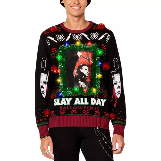 Bundle up with Michael Myers! This black Halloween II Christmas sweater features a ferociously festive knife print, blood-red tinsel poms, a large Michael Myers chest graphic, and colorful holiday lights. This cozy sweater makes a great gift for the ho-ho-horror lover in your life.