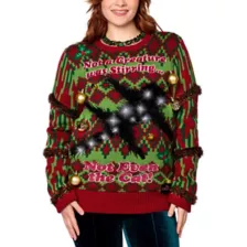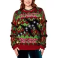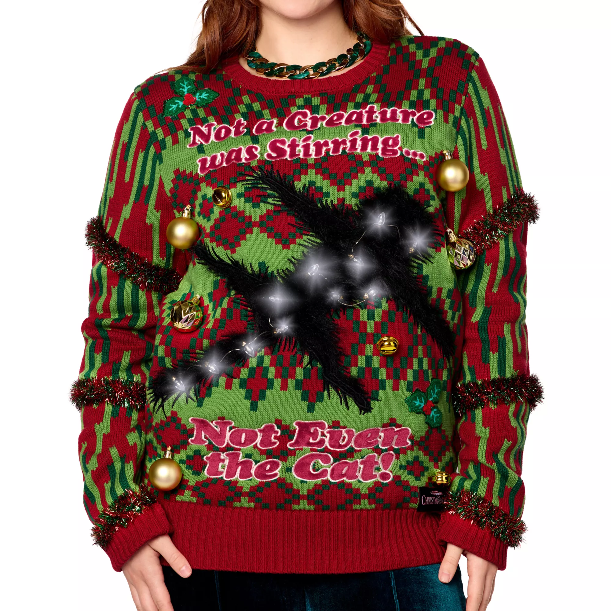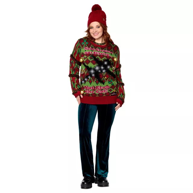 It's not Christmas until someone fries the cat! Rep your favorite holiday movie with this officially licensed National Lampoon's Christmas Vacation Cat Christmas Sweater. This light-up sweater features Aunt Bethany's poor feline mid-zap! With tangled lights and puffed-up fur, this sweater brings the perfect amount of chaos to any holiday party.