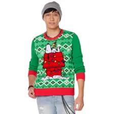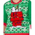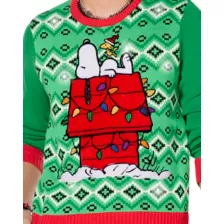 It's not the holidays without Snoopy! Wear this cheerful red and green holiday sweater and let your festive spirit shine. With glowing lights, bright red trim, and a snuggly Snoopy lying flat on top of his dog house, this sweater will make you feel warm and fuzzy.