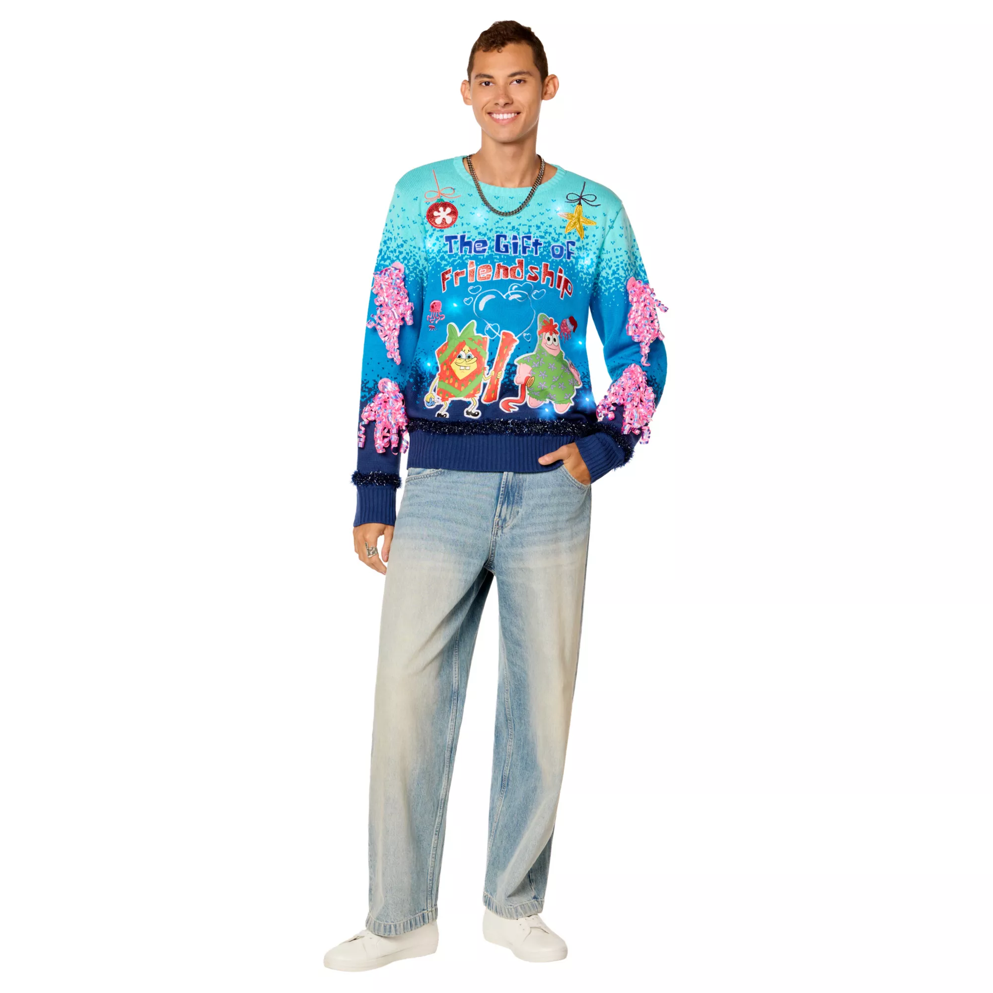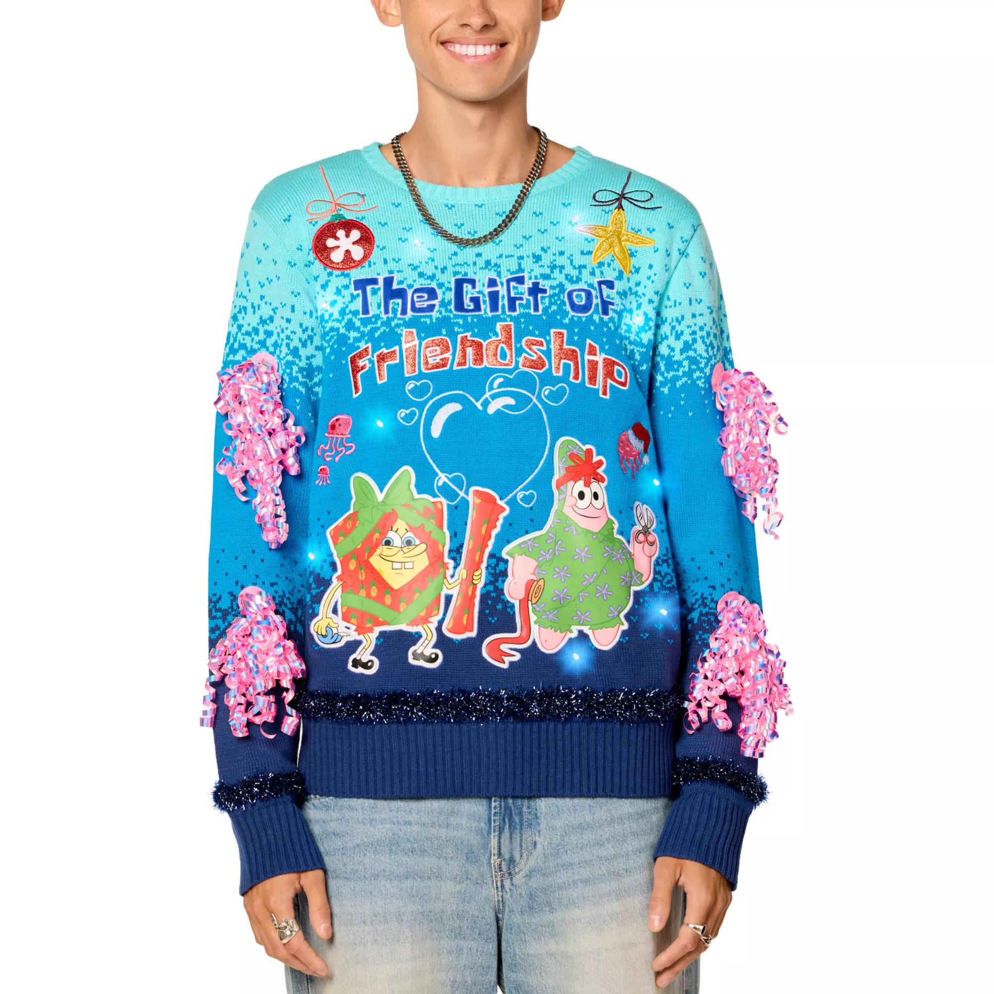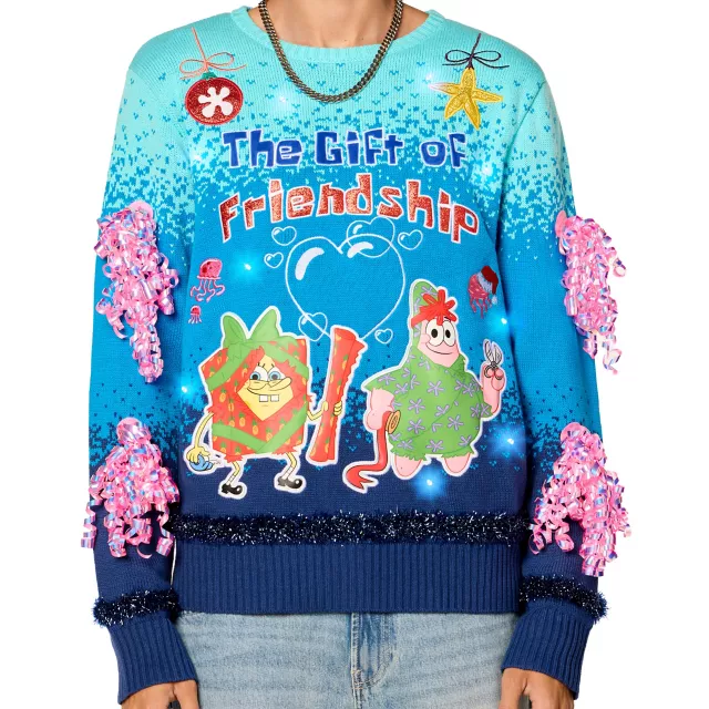 Because the true gift is your presence. Be the best dressed person in the friend group this Christmas when you sport this officially licensed Light-Up SpongeBob SquarePants The Gift of Friendship Christmas Sweater! Fitted with sewn-on tinsel and gift bows, cozy knit fabric, and jellyfish accents, this iconic sweater is a must-have for SpongeBob fans.