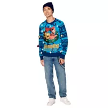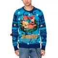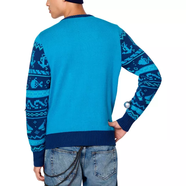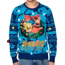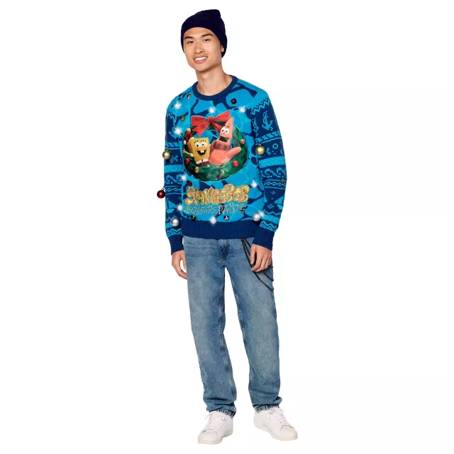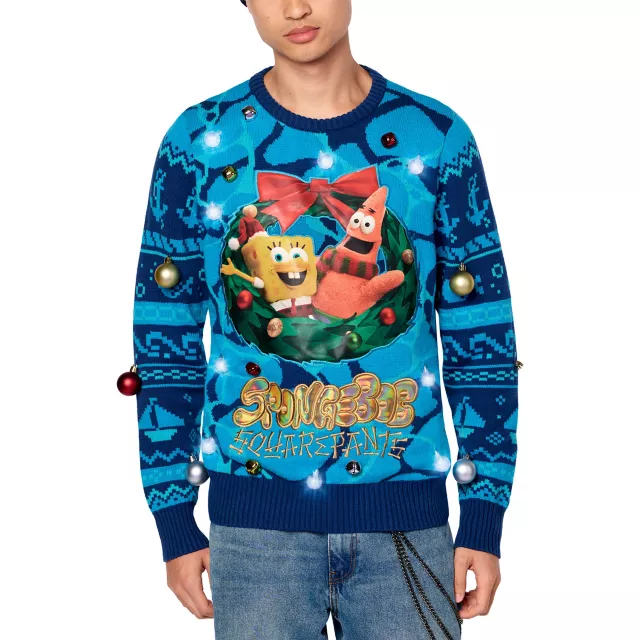 Celebrate the most wonderful time of the year like a Bikini Bottom citizen when you sport this officially licensed Light-Up SpongeBob SquarePants Wreath Christmas Sweater! Fitted with sewn-on bells and Christmas tree ornaments, cozy knit fabric, and a cheerful graphic of your favorite cartoon duo, this iconic sweater will have you diving into the holiday spirit in no time.