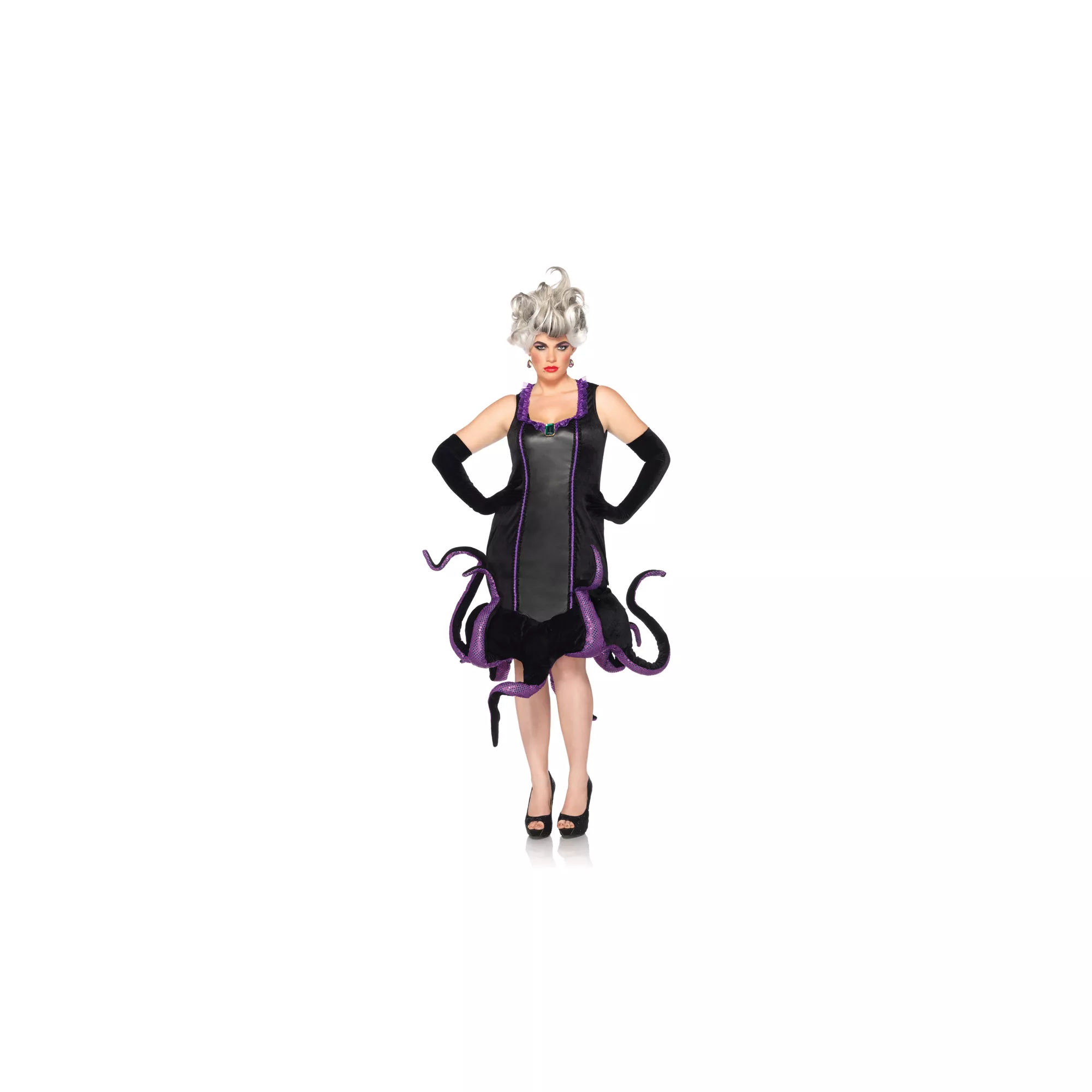 You'll look like you crawled right out of the ocean when you wear the officially licensed Little Mermaid Ursula Adult Women's Costume. This black character dress features purple trim and comes complete with attached tentacles and clear straps.