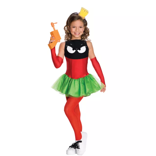 Kill them quietly in this fantastic and officially licensed Looney Tunes Marvin the Martian girls costume. Cook up some inter-galactic antics in the red, white, green, and black character dress, complete with yellow headpiece and red glovelettes.