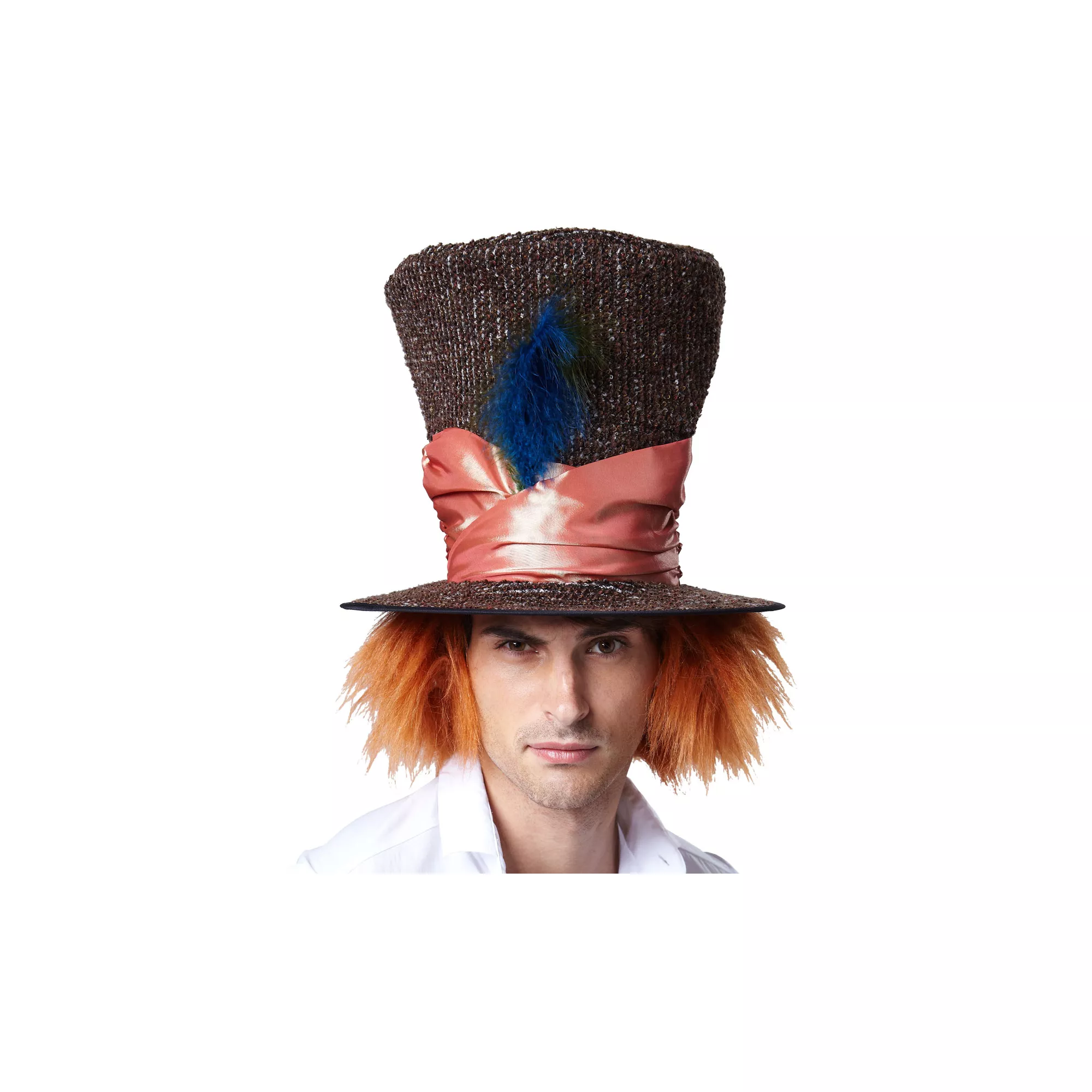 You'll pull more than rabbits out of this Magic Hat. That is, if you're a real life magician. Either way, you'll look like one wearing this over-sized top hat with brown weaved pattern, pink satin wrap and attached blue feather.