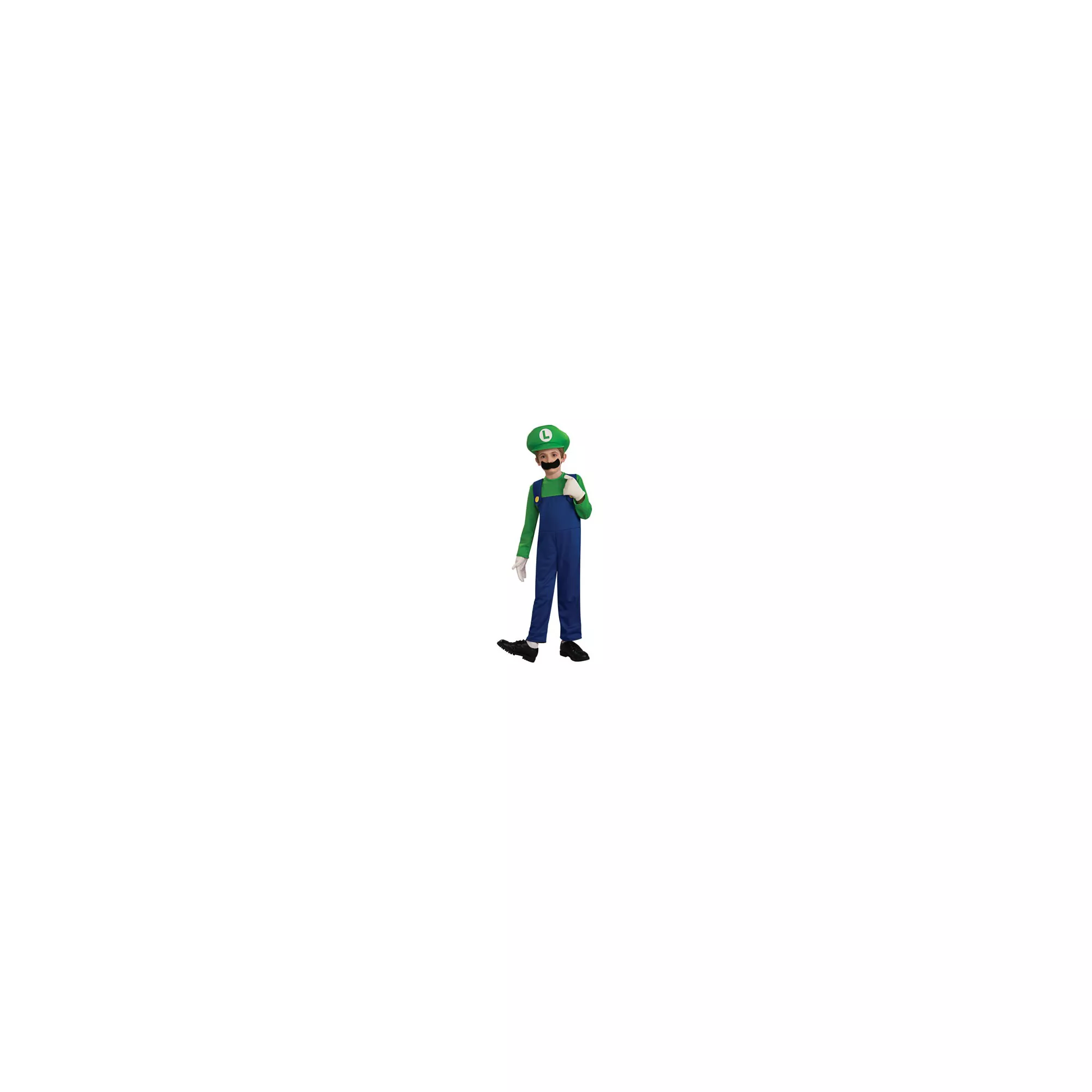 Step up to the challenge in this officially licensed Mario Bros. Luigi deluxe child costume. The blue and green, 100% polyester overall jumpsuit of this Luigi costume features yellow buttons and comes complete with a green oversized Luigi cap headpiece, inflatable belly, gloves and a mustache.