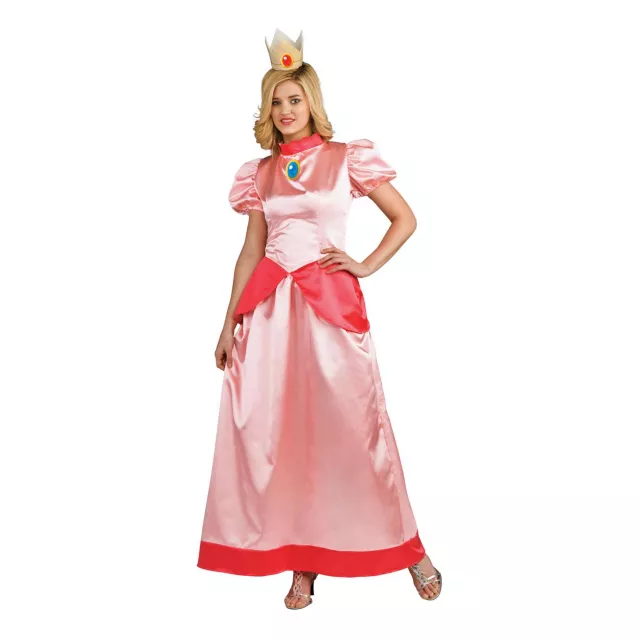 Feel no distress, only happiness because when you wear this officially licensed Mario Bros. Princess Peach adult womens costume someone will always save you! The pink on pink, 100% polyester, princess gown comes complete with puffy sleeves and a golden crown.