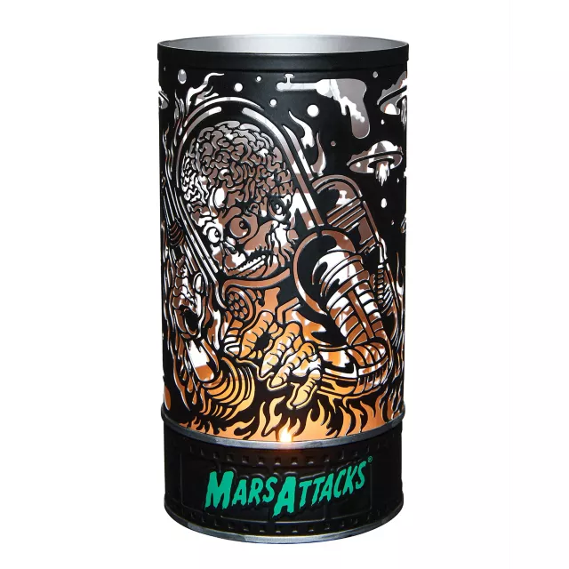 Add light and personality to your space with this Mars Attacks tabletop tea light candle holder! This official Mars Attacks candle holder features a unique Martian cutout design that allows light to pour out of it and into your Halloween scene.
