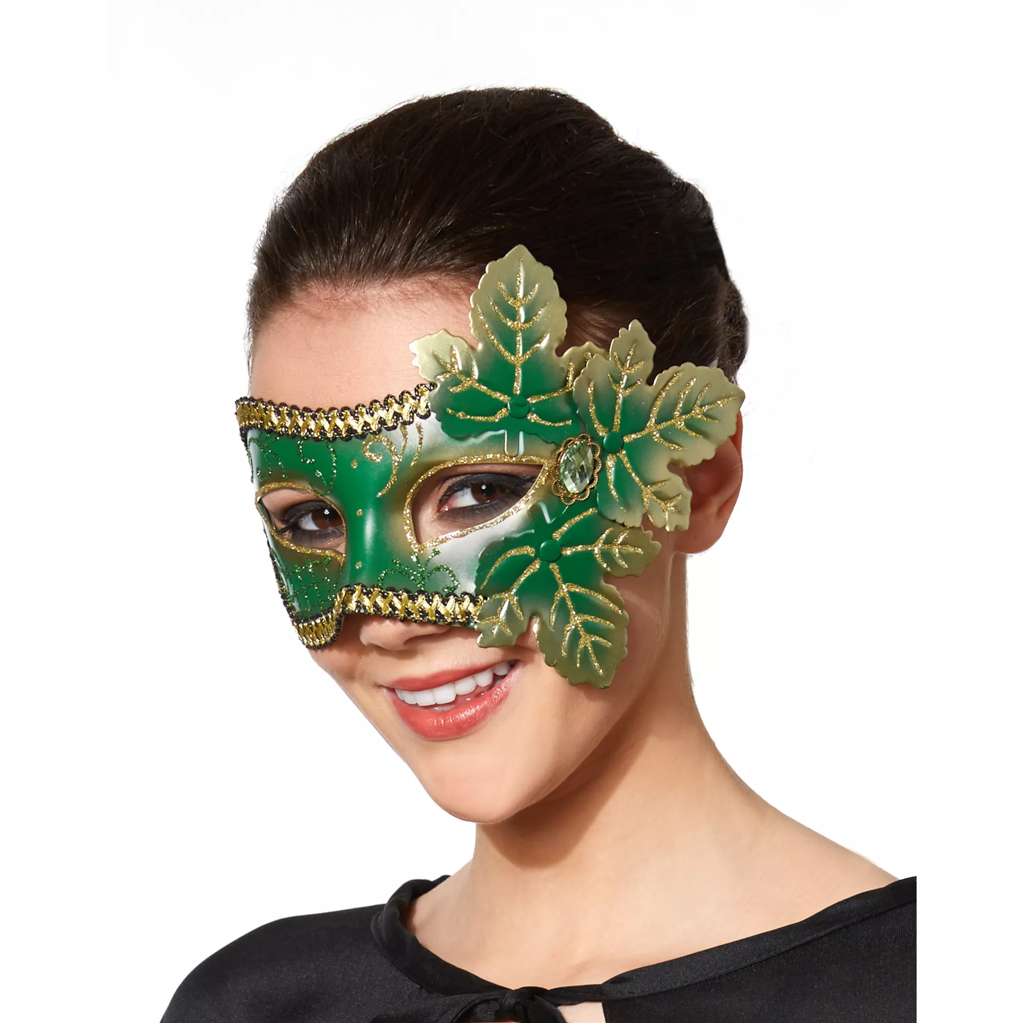 Unveil your mysterious side when you wear the Masquerade Mask. This beautiful emerald green mask features sparkly gold designs and leaf details.