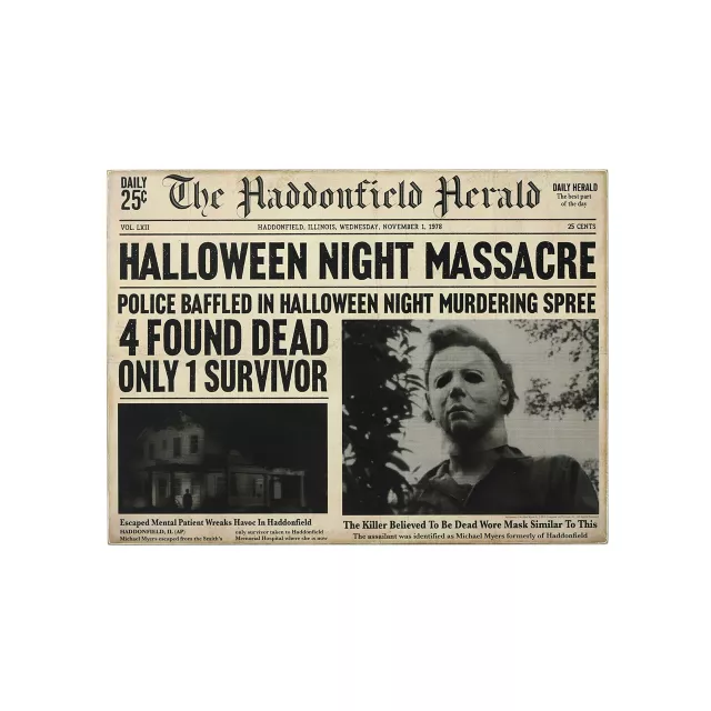 Decorate your home with a piece of Halloween history with this officially licensed Michael Myers Haddonfield Herald Sign. This snippet of what’s dubbed the “Halloween Night Massacre” shows an image of Michael Myers next to the headline that reads “4 Dead Only 1 Survivor.” If you’re a fan of the Halloween movies, this sign is a super cool tribute to the events of the film and will look great as a decoration.