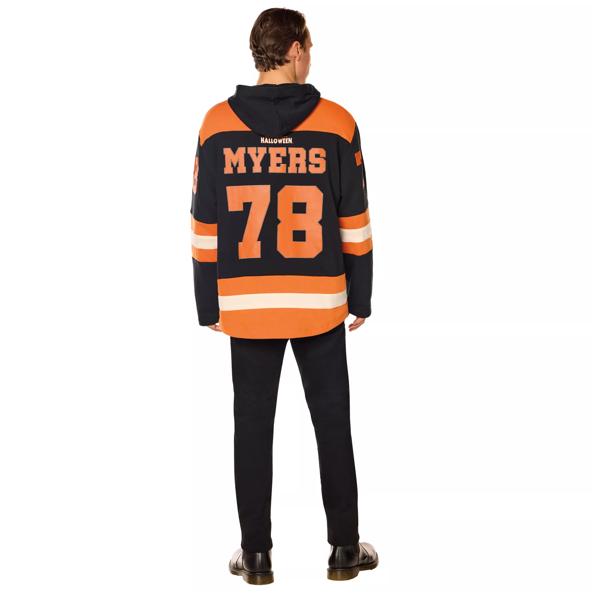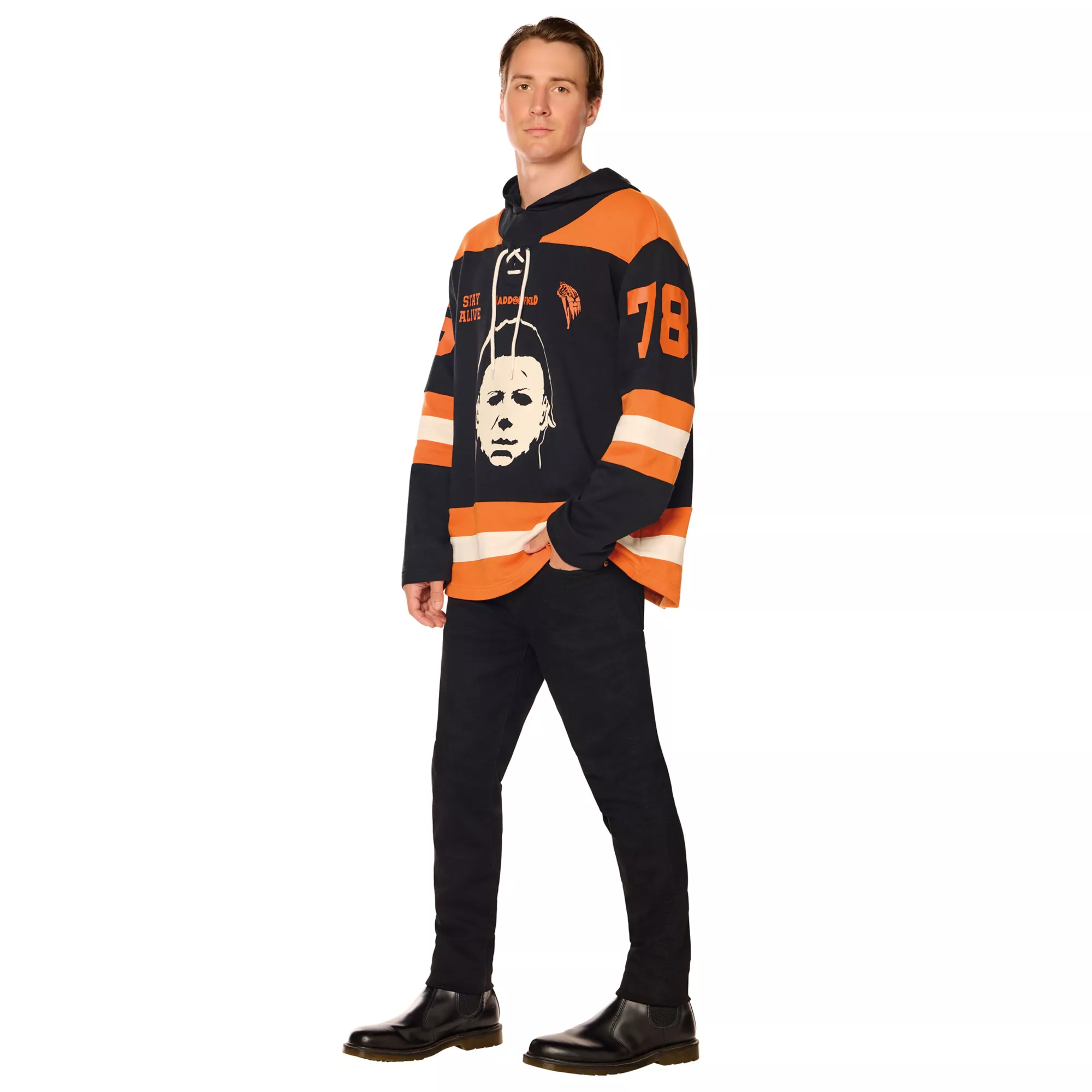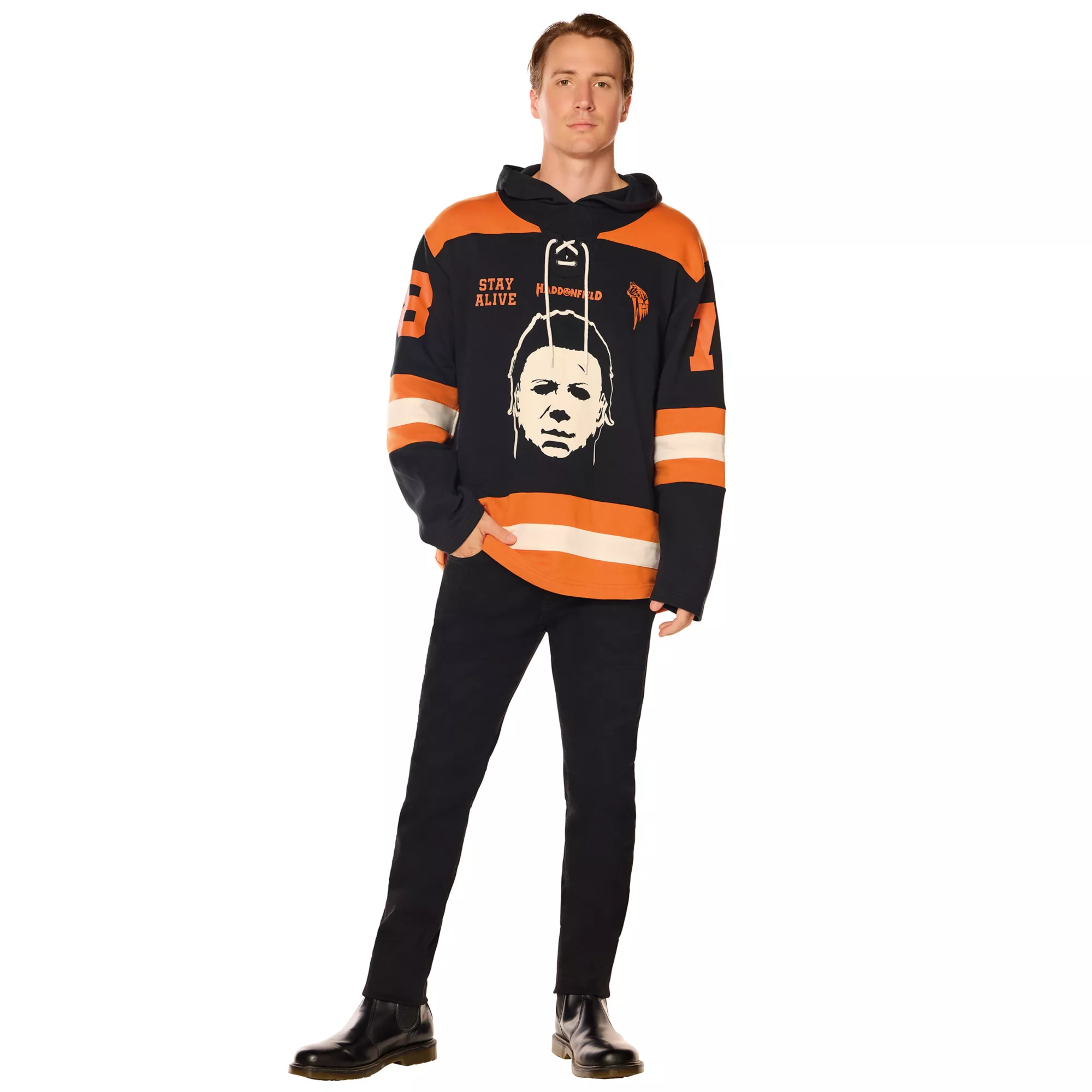 Cheer on the Haddonfield Slashers when you rock this officially licensed Michael Myers Haddonfield Hockey Hoodie. Emblazoned with the sinister villain's last name, image, and the number 78, this black and orange striped jersey-style sweatshirt is both stylish and nightmare-inducing.