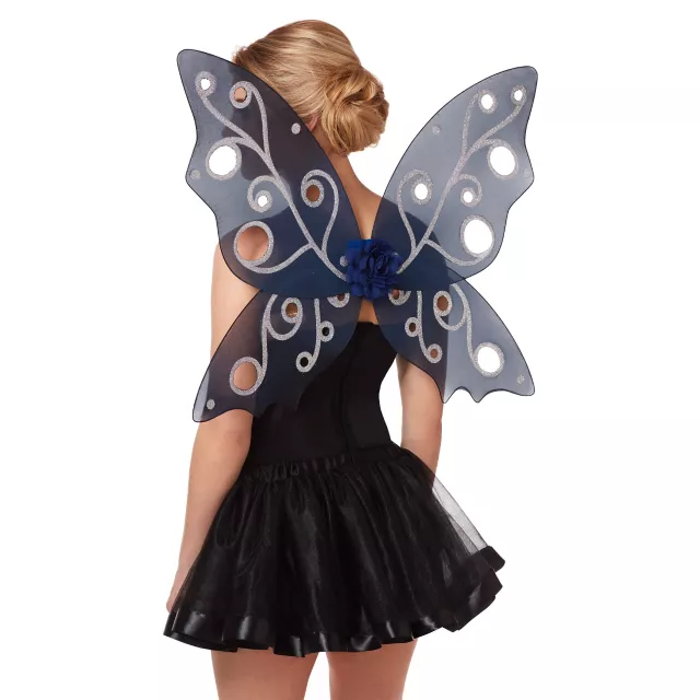 Add a beautiful, mysterious touch to any fairy, butterfly, or nature-themed costume with this lovely set of wings! These wings are dark blue and feature a silver glitter spiral design, making them perfect for any nighttime fairy!