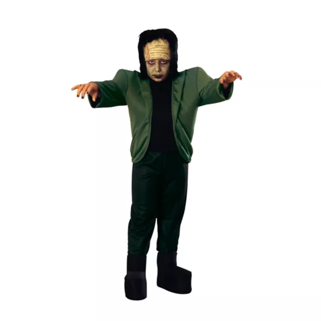 Walk like a zombie when you wear this officially licensed Monsters Frankenstein child costume and scare people silly. The jacket features a shirt insert and comes complete with matching pants with attached shoe covers along with a headpiece.