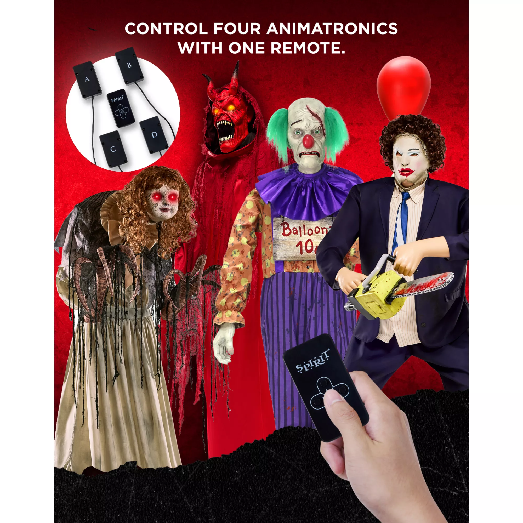 Patent Approved. Avoid the hassle of walking around to turn on all of your animatronics, and activate them all at once with this handy-dandy multi-prop remote! Control up to four animatronics at once, and make bringing your spooky scene to life an absolute breeze. And with each box labeled with the correct letter, you'll never have to second-guess which button will activate which animatronic!
