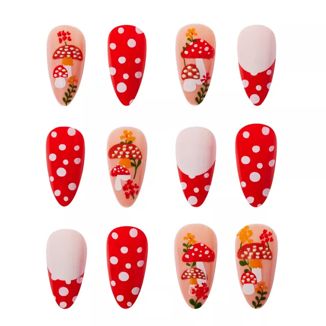 Elevate your costume this Halloween with these Mushroom Press-On Nails! With a mix of painted on mushrroms and red and white polka dots you will be sure to have the funkiest nails!