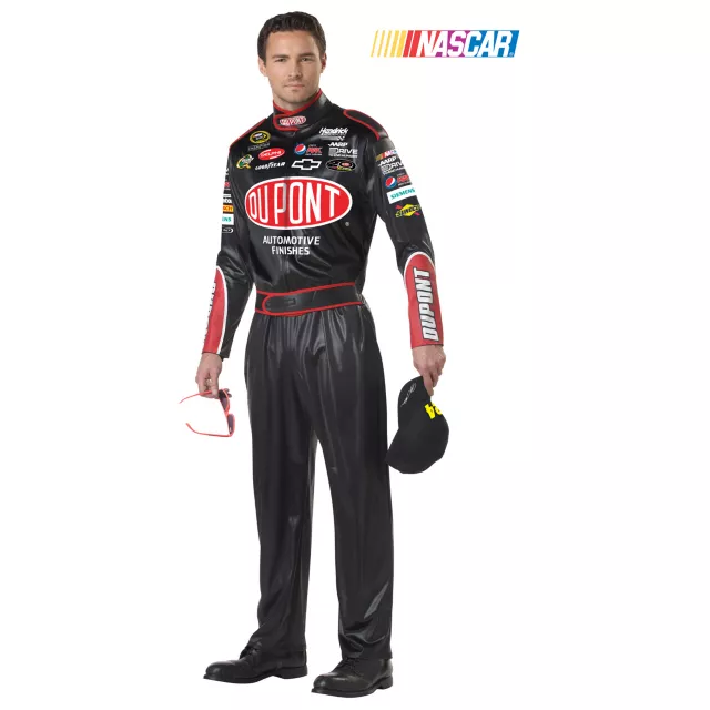 Vroom! Vroom! Get you engines going on Halloween when you wear this officially licensed NASCAR Jeff Gordon Adult Costume. Black and red polyester jumpsuit features a zipper closure, team logos and an attached belt, complete with matching hat and glasses.