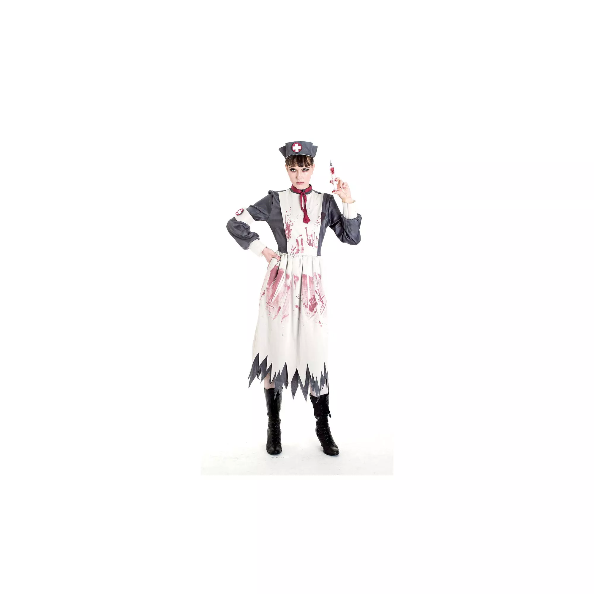 You don't need to take any nursing classes to don this Nurse Mercy adult womens costume. The gray, 100% polyester dress of this nurse costume features an attached light gray, blood-spattered apron and a jagged hem, complete with a matching nurse hat.
