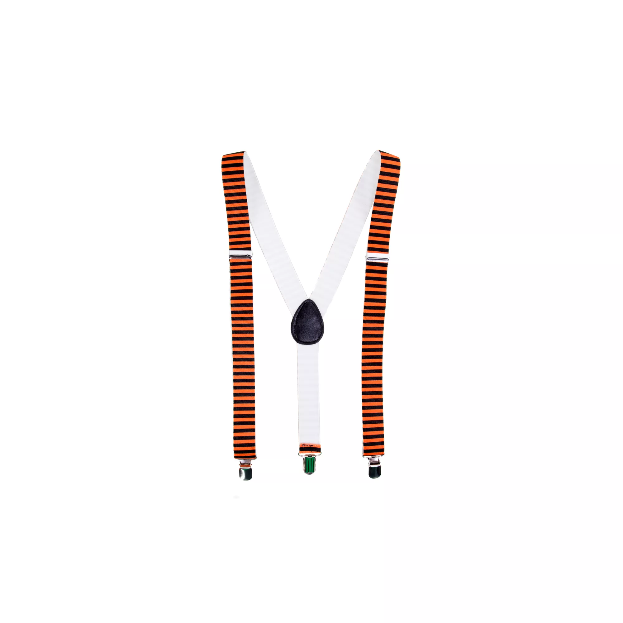 Add some holiday to spirit to any costume or outfit with these Orange and Black Striped Suspenders! These suspenders feature orange and black stripes and silver clasps.