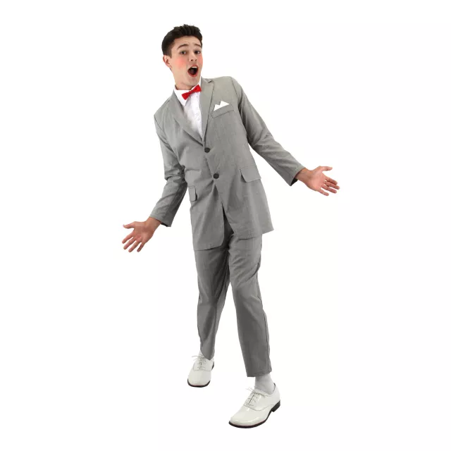 Have your own big adventure on Halloween when you wear the officially licensed adult mens Pee Wee Herman costume.The gray plaid suit jacket comes complete with matching pants, a white shirt front and a red bow tie - you add the manic cackle and the smirks!