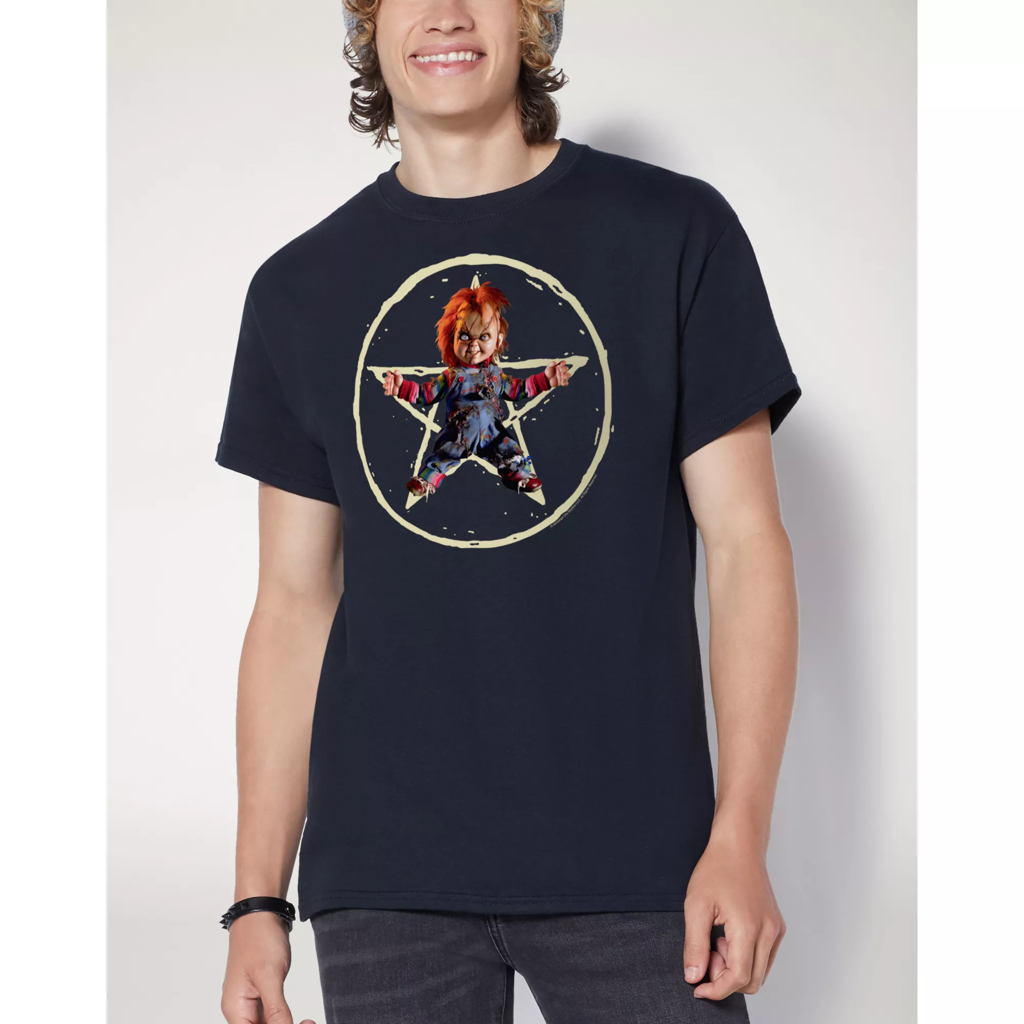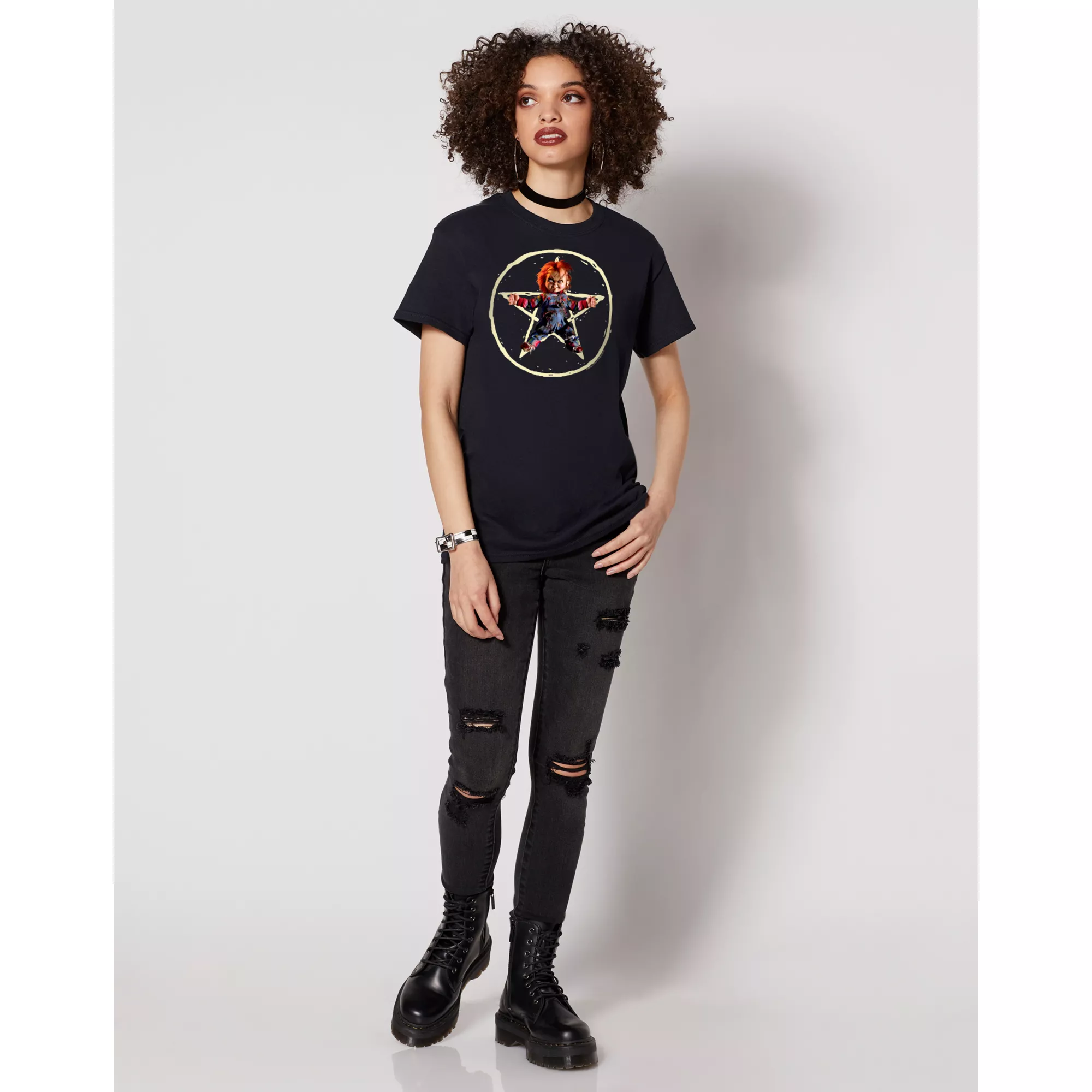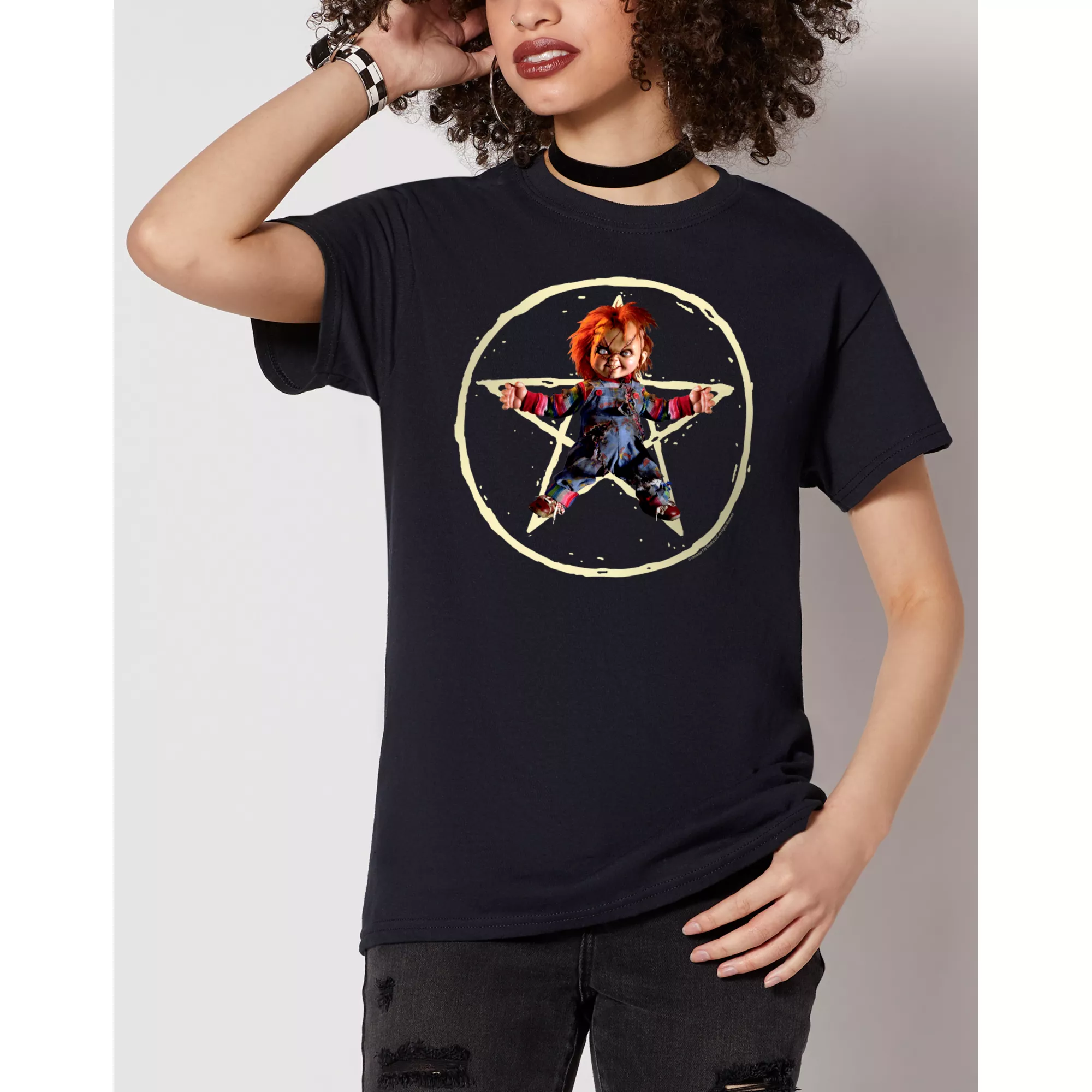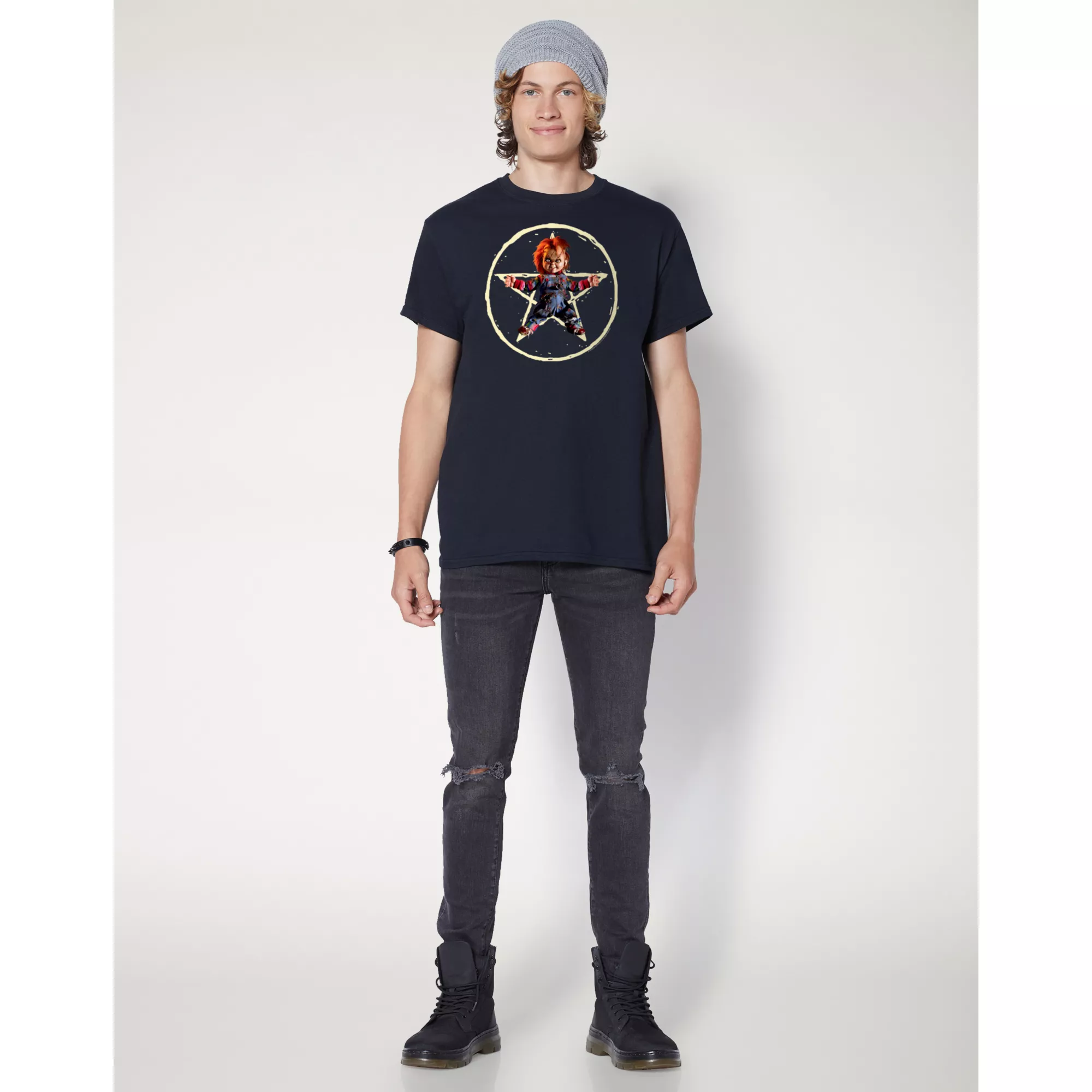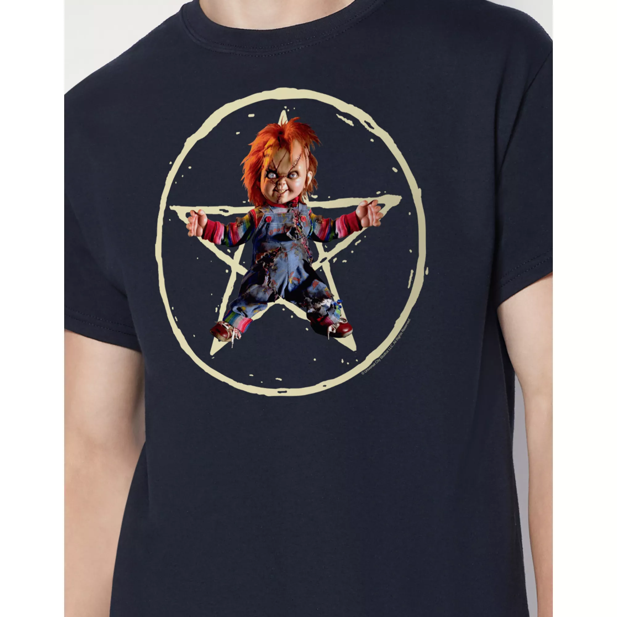 Who wants to play? This officially licensed Chucky Pentagram T Shirt makes getting dressed as easy as child's play! Show your appreciation for the most iconic slasher doll in the business in this devilishly comfortable Chucky t shirt.
