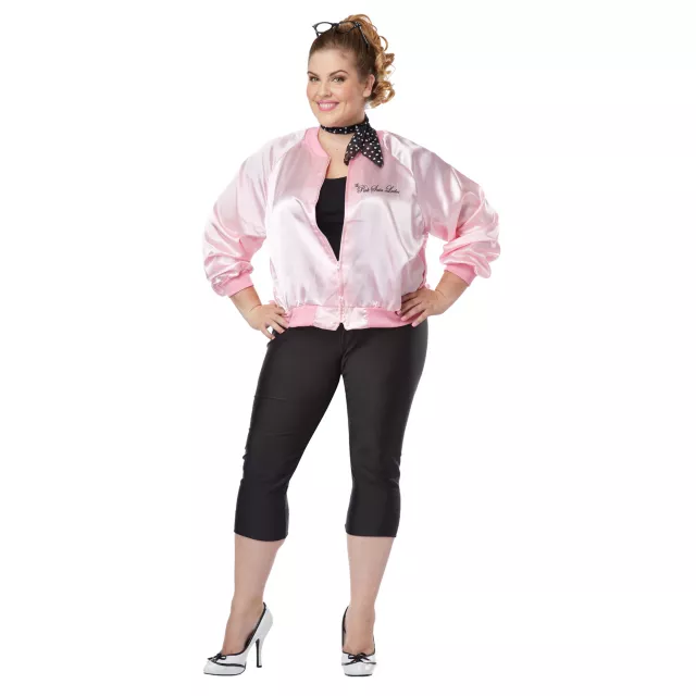 Flashback to the nifty 50's when you don this classic Pink Ladies adult womens plus size costume. Everyone will rev their engines when they catch you in the satin pink jacket of this plus size costume, complete with an adorable black and white polka dot scarf.