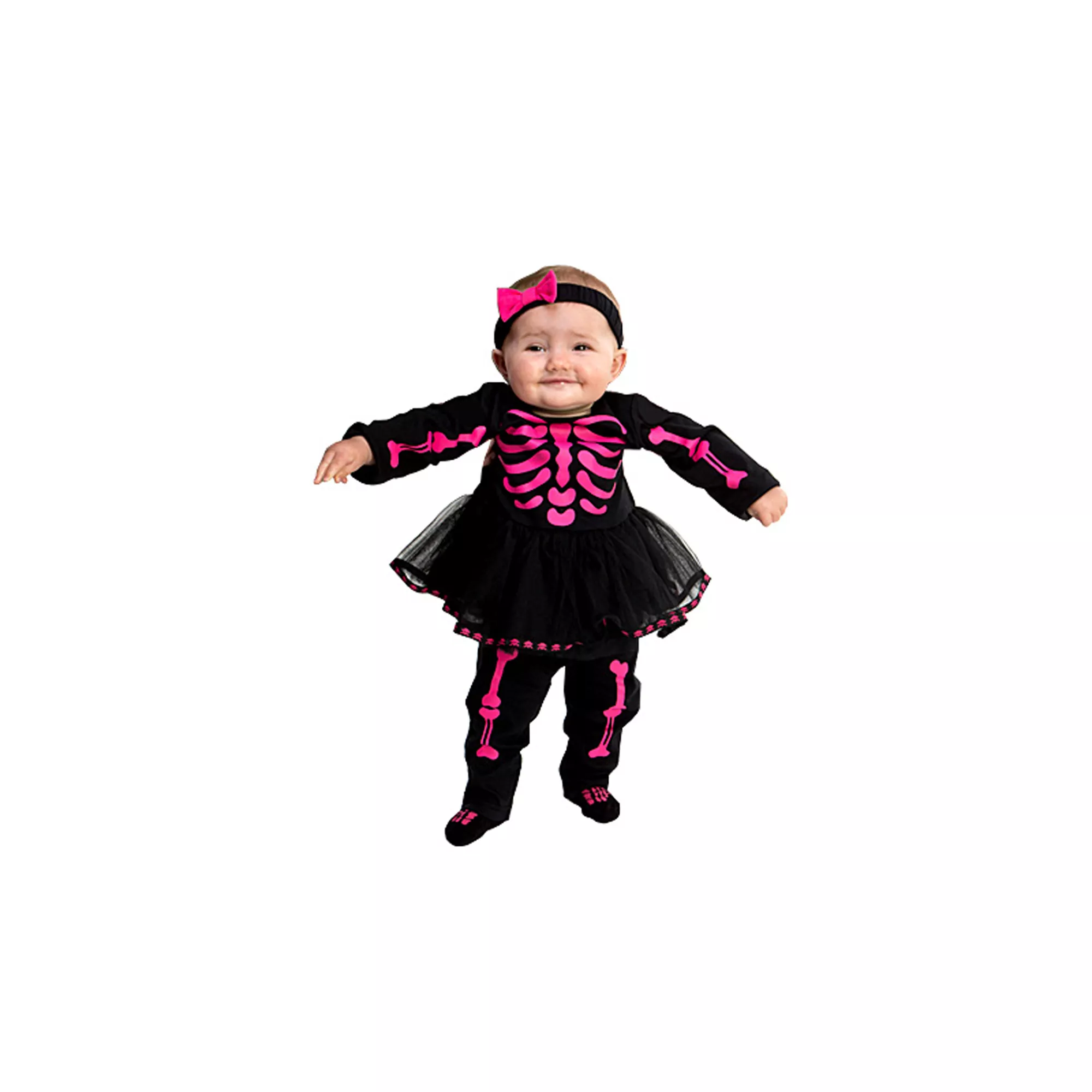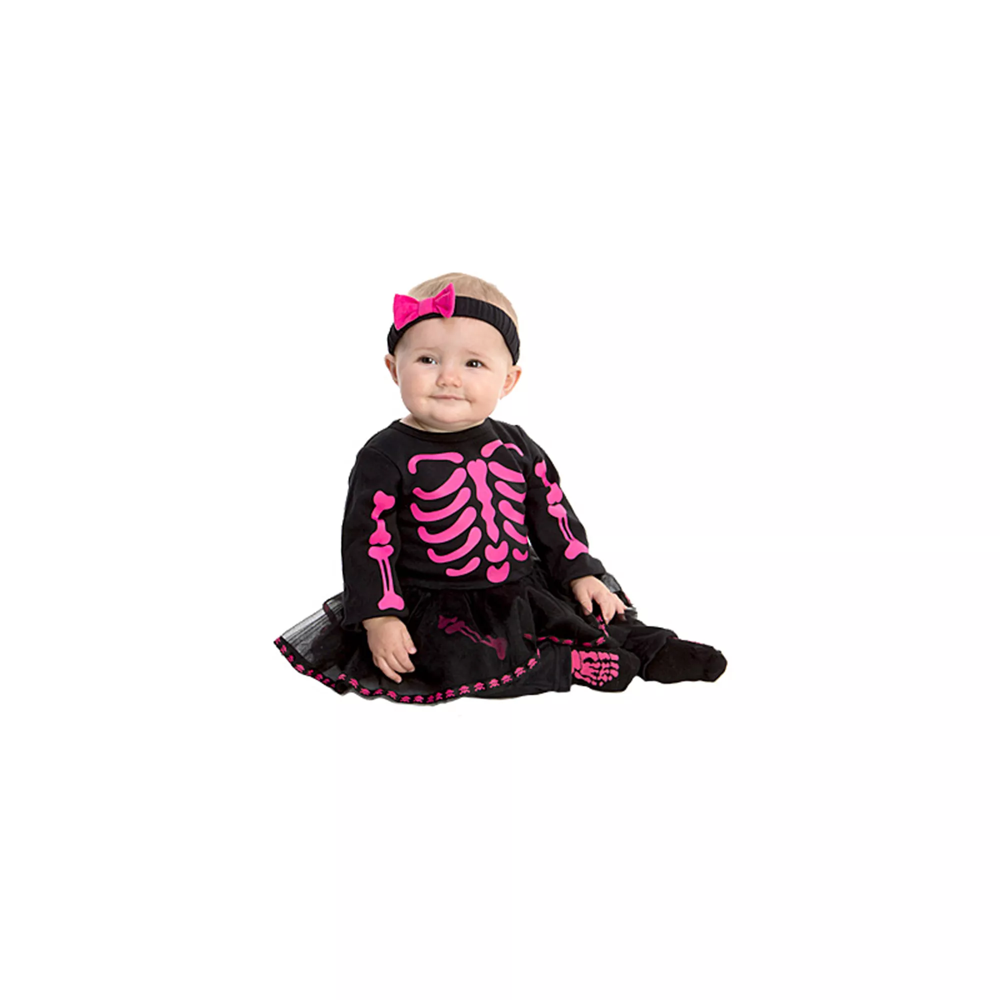 It's tough for something so cute to look scary, but give it a try anyway when you dress your little one in this adorable Pink Skeleton Baby Costume. Black top features pink bone print and comes complete with skirted pants, headband and socks.